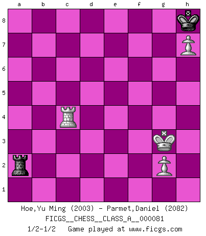 Last move : 1/2-1/2 2011 May 23 6:24:38 [Event "FICGS__CHESS__CLASS_A__000081"] [Site "FICGS"] [Date "2010.11.11"] [Round "1"] [White "Hoe,Yu Ming"] [Black "Parmet,Daniel"] [Result "1/2-1/2"] [WhiteElo "2003"] [BlackElo "2082"] 1.e4 e5 2.Nf3 Nc6 3.d4 exd4 4.Nxd4 Bc5 5.Nxc6 Qf6 6.Qd2 dxc6 7.Nc3 Ne7 8.Qf4 Qe6 9.Qxc7 O-O 10.Qg3 Nf5 11.Qg5 Nd4 12.Bd3 Be7 13.Qe3 Rd8 14.O-O Qe5 15.f4 Qh5 16.Qf2 b6 17.f5 Bb7 18.Ne2 Nxe2+ 19.Bxe2 Qh4 20.Qxh4 Bxh4 21.e5 Re8 22.Bf4 Bf6 23.exf6 Rxe2 24.Rf2 Rxf2 25.Kxf2 h5 26.fxg7 Kxg7 27.Rd1 Kf6 28.Rd6+ Kxf5 29.Rd7 Kxf4 30.Rxf7+ Ke5 31.Rxb7 Rf8+ 32.Kg3 h4+ 33.Kxh4 Rf2 34.Kg3 Rxc2 35.h4 Rxb2 36.Rxa7 c5 37.h5 Kf6 38.h6 Rb1 39.Rb7 c4 40.h7 Rh1 41.Rxb6+ Kg7 42.Rb7+ Kh8 43.Rc7 Ra1 44.Rxc4 Rxa2 1/2-1/2 Scotch game Kingside Castling by player Black (move 9) Kingside Castling by player White (move 14) 10 pieces endgame at move 35 : White KRPPP , Black KRPPP WHITE : King + 1 Rook 3 Pawns BLACK : King + 1 Rook 3 Pawns 9 pieces endgame at move 36 : White KRPPP , Black KRPP WHITE : King + 1 Rook 3 Pawns BLACK : King + 1 Rook 2 Pawns 8 pieces endgame at move 41 : White KRPPP , Black KRP WHITE : King + 1 Rook 3 Pawns BLACK : King + 1 Rook 1 Pawn 7 pieces endgame at move 44 : White KRPPP , Black KR WHITE : King + 1 Rook 3 Pawns BLACK : King + 1 Rook 6 pieces endgame at move 44 : White KRPP , Black KR WHITE : King + 1 Rook 2 Pawns BLACK : King + 1 Rook This chess game ended in a draw. Follow this game move after move (download)Blessed be the memory of him who gave the world this immortal game. (A. G. Gardiner) Ich verachte Kasparow. (Viktor Kortschnoi) El Ajedrez es una guerra en un tablero. El objetivo es aplastar la mente del oponente. (Bobby Fischer) Fischer est le meilleur joueur du monde et Karpov n'est qu'un joueur de bistrot. (Garry Kasparov, agé de 16 ans) You lose, general Kenobi. (General Grievous in Star Wars ep.3)
