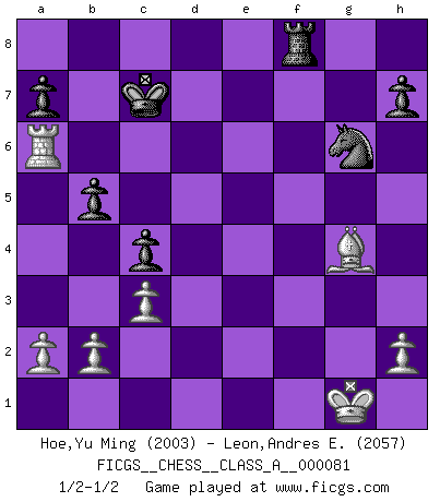 Last move : 1/2-1/2 2011 February 11 13:21:21 [Event "FICGS__CHESS__CLASS_A__000081"] [Site "FICGS"] [Date "2010.11.11"] [Round "1"] [White "Hoe,Yu Ming"] [Black "Leon,Andres E."] [Result "1/2-1/2"] [WhiteElo "2003"] [BlackElo "2057"] 1.e4 c6 2.d4 d5 3.e5 Bf5 4.Nf3 e6 5.Be2 Nd7 6.O-O Ne7 7.Nh4 c5 8.c3 Be4 9.Nd2 Nc6 10.Nxe4 dxe4 11.g3 Be7 12.d5 exd5 13.Qxd5 Bxh4 14.gxh4 Qxh4 15.e6 fxe6 16.Qxe6+ Qe7 17.Qxe7+ Nxe7 18.f3 exf3 19.Bxf3 O-O-O 20.Bg5 Nf6 21.Rae1 Ng6 22.Bxf6 gxf6 23.Bg4+ Kc7 24.Rxf6 Rhf8 25.Rf2 b5 26.Re6 c4 27.Rxf8 Rxf8 28.Ra6 1/2-1/2 Caro-Kann : Advance variation Kingside Castling by player White (move 6) Queenside Castling by player Black (move 19) This chess game ended in a draw. Follow this game move after move (download)The essence of Chess is thinking about what Chess is. (David Bronstein) Ich bin stolz ein Bulgare zu sein. (Veselin Topalov) Todos los Maestros de Ajedrez fueron un día unos principiantes. (Chernev) Roi des jeux et jeu des rois, les échecs portent en eux un sentiment d'infini. Ils donnent à celui qui s'est efforcé d'en approfondir les arcanes l'impression de n'être pas à la mesure de l'homme; en fait, ils constituent un résumé de l'univers, un microcosme, et figurent cette grande échelle qui, dans les plans de la lumière descend jusqu'à la matière, qui des abîmes insondables remonte jusqu'en l'infini de Dieu. (Pyrame) Beta. Software undergoes beta testing shortly before it's released. Beta is latin for still doesn't work. (Anonymous)