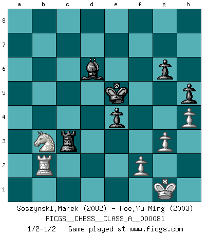 Last move : 1/2-1/2 2011 February 18 10:53:37 [Event "FICGS__CHESS__CLASS_A__000081"] [Site "FICGS"] [Date "2010.11.11"] [Round "1"] [White "Soszynski,Marek"] [Black "Hoe,Yu Ming"] [Result "1/2-1/2"] [WhiteElo "2082"] [BlackElo "2003"] 1.e4 c5 2.Nf3 Nc6 3.Bb5 g6 4.O-O Bg7 5.c3 Nf6 6.Re1 a6 7.Bf1 O-O 8.h3 e5 9.d3 d5 10.Nbd2 h6 11.a4 Re8 12.Qc2 b6 13.b3 Be6 14.Ba3 d4 15.b4 dxc3 16.Qxc3 cxb4 17.Bxb4 Rc8 18.Qb2 Nxb4 19.Qxb4 Nd7 20.Rec1 a5 21.Qb5 Nc5 22.Nc4 Nxd3 23.Bxd3 Qxd3 24.Nxb6 Rxc1+ 25.Rxc1 Qxb5 26.axb5 Rb8 27.Rc6 Bf6 28.Nd2 Bg5 29.Ndc4 Bxc4 30.Nxc4 Rxb5 31.Ra6 Rb4 32.Ra8+ Kg7 33.Nd6 a4 34.Ra7 Kf6 35.Nxf7 Rxe4 36.Nd8 Re1+ 37.Kh2 Kf5 38.Nb7 Re2 39.Kg1 Be7 40.Rxa4 Rb2 41.Ra7 Ke6 42.Kf1 e4 43.g3 h5 44.h4 Kd5 45.Kg1 Bb4 46.Ra1 Ke5 47.Rd1 Be7 48.Na5 Rc2 49.Nb3 Rc3 50.Rb1 Bd6 51.Rb2 Ba3 52.Rb1 Bd6 53.Rb2 1/2-1/2 Sicilian : Nimzovich-Rossolimo attack (with ...g6, without ...d6) Kingside Castling by player White (move 4) Kingside Castling by player Black (move 7) This chess game ended in a draw. Follow this game move after move (download)Adequate compensation for a sacrifice is having a sound combination leading to a winning position; adequate compensation for a blunder is having your opponent snatch defeat from the jaws of victory. (Bruce A. Moon) Ich kenne keine einzige Person, die behaupten würde, Garri Kasparow sei ein guter Mensch (Nigel Short) Después de la respuesta de las negras a 1.e4 con 1..e5, se quedan siempre tratando de entrar dentro del juego. (Howard Staunton) Le jeu d'échecs est comme rejeté hors du temps. (Antoine de Saint-Exupéry) Pretend inferiority and encourage his arrogance. (Sun Tzu)