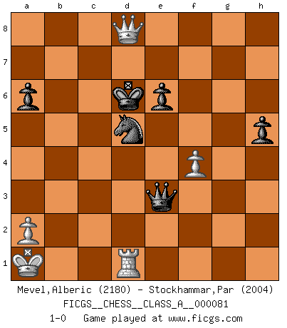 Last move : 1-0 2012 January 18 18:26:41 [Event "FICGS__CHESS__CLASS_A__000081"] [Site "FICGS"] [Date "2010.11.11"] [Round "1"] [White "Mevel,Alberic"] [Black "Stockhammar,Par"] [Result "1-0"] [WhiteElo "2180"] [BlackElo "2004"] 1.e4 c6 2.d4 d5 3.Nd2 dxe4 4.Nxe4 Bf5 5.Ng3 Bg6 6.h4 h6 7.Nf3 Nd7 8.h5 Bh7 9.Bd3 Bxd3 10.Qxd3 Qc7 11.Bd2 Ngf6 12.O-O-O e6 13.Ne4 Nxe4 14.Qxe4 Nf6 15.Qe2 O-O-O 16.Kb1 Bd6 17.c4 c5 18.Bc3 cxd4 19.Nxd4 a6 20.g3 Rd7 21.Rc1 Kb8 22.Nf3 Qc5 23.Ne5 Bxe5 24.b4 Qb6 25.Bxe5+ Kc8 26.b5 Rhd8 27.Rc2 Qc5 28.bxa6 bxa6 29.Rb2 Rb7 30.Rxb7 Kxb7 31.Ka1 Kc8 32.g4 Qa5 33.Bb2 Rd2 34.Qf3 Kd7 35.Rc1 Ke8 36.c5 Nd5 37.c6 f6 38.c7 Nxc7 39.Qb7 Kd8 40.g5 hxg5 41.h6 Rxb2 42.Qxb2 gxh6 43.Qxf6+ Kd7 44.f3 h5 45.Qf7+ Kd6 46.Qg7 Qb6 47.Rd1+ Nd5 48.Qxg5 Qf2 49.f4 Qe3 50.Qd8+ 1-0 This chess game has been lost on time (started : 2010.11.11 20:52:7) Caro-Kann : 3.Nd2 Queenside Castling by player White (move 12) Queenside Castling by player Black (move 15) Player White won this chess game. Follow this game move after move (download)Modern Chess is too much concerned with things like Pawn structure. Forget it, Checkmate ends the game. (Nigel Short) Glücklicherweise sind Großmeister Ruben Fines reine Schachbücher weniger phallozentrisch [als seine Schachpsychologie] und deswegen auch weniger lächerlich. (Nigel Short) Coloca el contenido de las piezas del Ajedrez en un sombrero, agitalo vigorosamente, arrojalas en un tablero desde una altura de 30 centimetros y así obtendras el estilo de Steinitz. (H. E. Bird) Donnez-moi un Cavalier en 6e et je gagnerais toutes mes parties. (Steinitz) Hold em is to stud what chess is to checkers. (Johnny Moss)