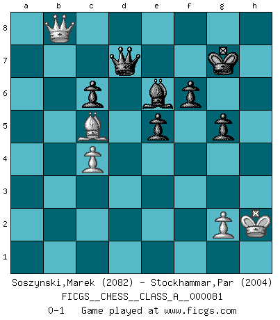 Last move : 0-1 2011 June 19 23:13:41 [Event "FICGS__CHESS__CLASS_A__000081"] [Site "FICGS"] [Date "2010.11.11"] [Round "1"] [White "Soszynski,Marek"] [Black "Stockhammar,Par"] [Result "0-1"] [WhiteElo "2082"] [BlackElo "2004"] 1.e4 c6 2.Nc3 d5 3.Qf3 dxe4 4.Nxe4 Nd7 5.d4 Ngf6 6.Bc4 Nb6 7.Bd3 Qxd4 8.Ne2 Qe5 9.O-O Nxe4 10.Bxe4 Qf6 11.Qg3 e5 12.a4 Be7 13.a5 Nd7 14.a6 bxa6 15.Qc3 Nc5 16.Ng3 Nxe4 17.Nxe4 Qe6 18.Ra5 f6 19.Be3 O-O 20.Nc5 Bxc5 21.Bxc5 Rd8 22.Ra4 Rd5 23.f3 Qf7 24.Bf2 Qc7 25.Qc4 a5 26.b3 Be6 27.Qh4 Rd2 28.Qe4 Bd5 29.Qf5 Qd8 30.c4 g6 31.Qb1 Bf7 32.Re1 Rb8 33.Bxa7 Rb7 34.Bc5 Kg7 35.h4 Be6 36.Kh2 Bf5 37.Qa1 Rxb3 38.Rxa5 Rxf3 39.Ra7+ Kh6 40.Ra3 Rxa3 41.Qxa3 Rc2 42.Qe3+ Kh5 43.Rc1 Rb2 44.Re1 h6 45.Re2 Rxe2 46.Qxe2+ Bg4 47.Qe3 g5 48.Bb6 Qd7 49.Bc5 Qe6 50.hxg5 hxg5 51.Qd3 Qd7 52.Qf1 Kg6 53.Qb1+ Kg7 54.Qb8 Be6 0-1 Caro-Kann : GOldman (Spielmann) variation Kingside Castling by player White (move 9) Kingside Castling by player Black (move 19) Player Black won this chess game. Follow this game move after move (download)Checkers is for tramps. (Paul Morphy) Capablanka war das größte Genie der Schachgeschichte! Aber denken sie nicht er habe nichts vom Schach verstanden. Er wusste nur soviel wie er wissen musste um seine Ziele zu erreichen. (Mikhail Moiseyevich Botvinik) Yo he agregado estos principios a la ley: pongan los Caballos en acción antes de que los dos Alfiles sean desarrollados. (Emanuel Lasker) Un footballeur joue avec ses pieds, parfois avec sa tête. Un joueur d'échecs ne joue qu'avec sa tête. Et quand il ne joue plus, il meurt. (Jacob Murray) Kids, you tried your best and you failed miserably. The lesson is, never try. (Simpsons)