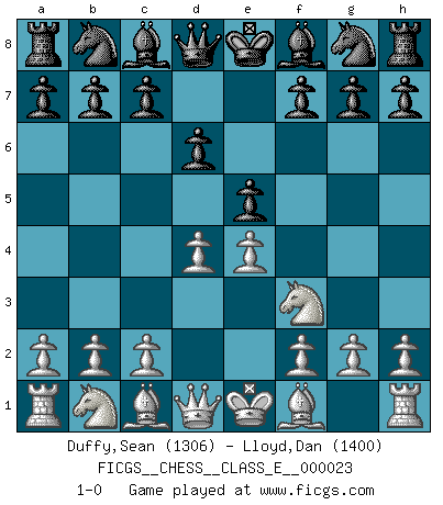 Last move : 1-0 2007 January 13 12:1:37 [Event "FICGS__CHESS__CLASS_E__000023"] [Site "FICGS"] [Date "2006.11.29"] [Round "1"] [White "Duffy,Sean"] [Black "Lloyd,Dan"] [Result "1-0"] [WhiteElo "1306"] [BlackElo "1400"] 1.e4 e5 2.Nf3 d6 3.d4 1-0 This chess game has been lost on time (started : 2006.11.29 12:48:56) Philidor's defense Player White won this chess game. Follow this game move after move (download)It is the aim of the modern school, not to treat every position according to one general law, but according to the principle inherent in the position. (Richard Reti) Ich rechne überhaupt nicht voraus. Ich gewinne auch so. (Robert James Fischer) Por la belleza de sus partidas, la claridad de su juego y lo brillante de sus ideas, Fischer se creó el mismo como un artista de la misma estatura como Brahms, Rembrandt y Shakespeare. (David Levy) Psychologiquement, tu dois avoir confiance en toi même, mais cette confiance doit être basée sur des faits. (Robert Fischer) Perhaps chess is the wrong game for the times (The Chess Master and the Computer, by Garry Kasparov - 2010)