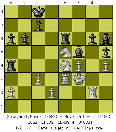 Last move : 1/2-1/2 2011 May 10 7:48:21 [Event "FICGS__CHESS__CLASS_A__000081"] [Site "FICGS"] [Date "2010.11.11"] [Round "1"] [White "Soszynski,Marek"] [Black "Mevel,Alberic"] [Result "1/2-1/2"] [WhiteElo "2082"] [BlackElo "2180"] 1.e4 e5 2.Nf3 Nc6 3.Bb5 a6 4.Bxc6 dxc6 5.O-O Ne7 6.Nxe5 Qd4 7.Qh5 g6 8.Qg5 Bg7 9.Nd3 f5 10.e5 c5 11.b3 Qg4 12.Qe3 f4 13.Qe4 f3 14.Qxg4 Bxg4 15.Re1 b6 16.Nc3 fxg2 17.Kxg2 Rf8 18.Bb2 O-O-O 19.Ne4 Nc6 20.f4 Bf5 21.Kf3 Nd4+ 22.Bxd4 Rxd4 23.h4 h5 24.Re3 c4 25.bxc4 Rxc4 26.c3 Bh6 27.Rg1 Ra4 28.Nf6 Kb7 29.Ne4 Kb8 30.Rg2 Kc8 31.e6 Re8 32.Ne5 Rxe6 1/2-1/2 Ruy Lopez : Exchange variation, 5.O-O Kingside Castling by player White (move 5) Queenside Castling by player Black (move 18) This chess game ended in a draw. Follow this game move after move (download)There are two classes of men; those who are content to yield to circumstances and who play whist; those who aim to control circumstances, and who play Chess. (Mortimer Collins) Du musst nicht gut spielen, es reicht, wenn du besser spielst als dein Gegner. (Anonymous) Todo se encuentra en un estado de flujo y esto incluye al mundo del Ajedrez. (Mikhail Botvinnik) Soyez une menace à chaque fois que vous vous asseyez pour jouer. (Ken Smith) I don't believe in psychology. I believe in good moves. (Bobby Fischer)