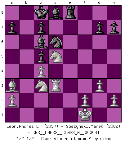 Last move : 1/2-1/2 2010 December 10 19:10:2 [Event "FICGS__CHESS__CLASS_A__000081"] [Site "FICGS"] [Date "2010.11.11"] [Round "1"] [White "Leon,Andres E."] [Black "Soszynski,Marek"] [Result "1/2-1/2"] [WhiteElo "2057"] [BlackElo "2082"] 1.e4 e5 2.Nf3 Nc6 3.Bb5 Nf6 4.O-O Nxe4 5.d4 Nd6 6.Bxc6 dxc6 7.dxe5 Nf5 8.Qxd8+ Kxd8 9.Nc3 Bd7 10.Rd1 Kc8 11.Ng5 Be8 12.b3 b6 13.Bb2 Be7 14.Nge4 Kb7 15.Rd3 Rd8 16.Rad1 Kc8 17.g3 Bd7 18.Ne2 c5 19.c4 Bc6 20.N4c3 Rxd3 21.Rxd3 Re8 22.Nd5 f6 23.Kf1 fxe5 24.Bxe5 Bd8 25.Bb2 b5 26.Nec3 bxc4 27.bxc4 Nd6 28.Ba3 1/2-1/2 Ruy Lopez : Berlin defense, Open variation Kingside Castling by player White (move 4) This chess game ended in a draw. Follow this game move after move (download)As one by one I mowed them down, my superiority soon became apparent. (Jose Capablanca) Wir irren allesamt, nur jeder irrt anders. (Georg Christoph Lichtenberg) Un jugador que es sorprendido, esta derrotado a medias. (Proverbio) Comme les marins qui ont mille raisons différentes d'aller en mer, les joueurs d'échecs en ont tout autant avant de s'installer devant une table et jouer... (Vincent Bertignac, philosophe) Tomorrow's what you make of it. (Horatio Caine, C.S.I. Miami)