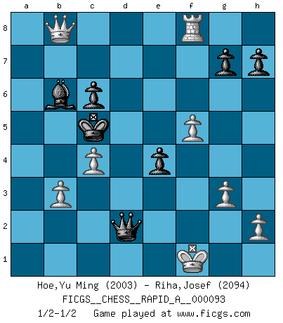 Last move : 1/2-1/2 2010 December 31 8:25:22 [Event "FICGS__CHESS__RAPID_A__000093"] [Site "FICGS"] [Date "2010.11.13"] [Round "1"] [White "Hoe,Yu Ming"] [Black "Riha,Josef"] [Result "1/2-1/2"] [WhiteElo "2003"] [BlackElo "2094"] 1.e4 c6 2.d4 d5 3.e5 Bf5 4.Nf3 e6 5.Be2 c5 6.Be3 cxd4 7.Nxd4 Ne7 8.Bg5 Qa5+ 9.Nc3 Bg6 10.Nb3 Qb6 11.O-O Nd7 12.Be3 Qc7 13.Nb5 Qxe5 14.Bxa7 Nc6 15.f4 Qxb2 16.Nc7+ Kd8 17.Nxa8 Nxa7 18.c4 d4 19.Bf3 Bc2 20.Qd2 Qc3 21.Qf2 Bxb3 22.axb3 Nc6 23.Bxc6 bxc6 24.Kh1 Bc5 25.f5 e5 26.Qh4+ Nf6 27.Nb6 Bxb6 28.Ra8+ Kc7 29.Rxh8 d3 30.Rf8 d2 31.Rxf7+ Kc8 32.Qh3 Qd4 33.Qf3 Ne4 34.g3 Nf2+ 35.Kg2 e4 36.Rf8+ Kd7 37.Qh5 d1Q 38.Rxd1 Qxd1 39.Qe8+ Kd6 40.Qb8+ Kc5 41.Kxf2 Qd2+ 42.Kf1 1/2-1/2 Caro-Kann : Advance variation Kingside Castling by player White (move 11) Promotion Queen by player Black (move 37) This chess game ended in a draw. Follow this game move after move (download)The game of chess is the touchstone of the intellect. (Goethe) Wenn Spassky eine Figur opfert kannst du genauso gut aufgeben. Aber wenn Tal eine Figur opfert, spiel weiter. Er könnte noch eine weitere opfern, und dann ... wer weiß? (Miguel Najdorf) Todavía soy una víctima del Ajedrez. Tiene toda la belleza del arte y mucho mas. No puede ser comercializado. El Ajedrez es mas puro que el arte en su posición social. (Marcel Duchamp) J'apprécie les joueurs d'est-indienne, c'est grâce à eux que je nourris ma famille depuis tant d'années. (Petrosian) If you don't practice you don't deserve to win. (Andre Agassi)