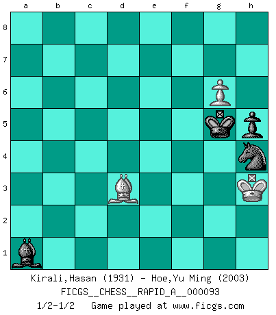Last move : 1/2-1/2 2011 April 18 18:25:2 [Event "FICGS__CHESS__RAPID_A__000093"] [Site "FICGS"] [Date "2010.11.13"] [Round "1"] [White "Kirali,Hasan"] [Black "Hoe,Yu Ming"] [Result "1/2-1/2"] [WhiteElo "1931"] [BlackElo "2003"] 1.d4 d5 2.Nf3 Nf6 3.c4 c6 4.Nc3 e6 5.e3 Nbd7 6.Bd3 dxc4 7.Bxc4 b5 8.Bd3 Bd6 9.O-O O-O 10.Qc2 Bb7 11.Bd2 b4 12.Ne4 Nxe4 13.Bxe4 f5 14.Bd3 c5 15.Be2 Rc8 16.Qd1 c4 17.Qe1 Qe7 18.a3 bxa3 19.bxa3 Bxa3 20.Ra2 Bd5 21.Qa1 Bd6 22.Rxa7 Ra8 23.Ra5 Rxa5 24.Qxa5 Ra8 25.Qb5 Rb8 26.Qa5 Nf6 27.Rc1 Ba3 28.Rxc4 Bxc4 29.Bxc4 Rb1+ 30.Be1 g6 31.Bxe6+ Kg7 32.g3 Bb4 33.Qa2 Rc1 34.Qb2 Rxe1+ 35.Nxe1 Bxe1 36.d5 Qb4 37.Qe5 Qc3 38.Qxc3 Bxc3 39.h3 h5 40.f3 Kf8 41.Kf2 Ke7 42.Ke2 Be5 43.Kf2 Bb8 44.f4 Ne4+ 45.Kf3 Nc5 46.Bc8 Ba7 47.g4 Kf6 48.Ke2 Ne4 49.g5+ Ke7 50.Ba6 Nc3+ 51.Kf3 Nxd5 52.e4 fxe4+ 53.Kxe4 Nc7 54.Bd3 Ne6 55.Kf3 Kf7 56.Bc4 Bb8 57.f5 gxf5 58.h4 Ke7 59.Bd3 Ng7 60.Bb1 Ke6 61.Bd3 Ke5 62.Bc2 f4 63.Kg2 Nf5 64.Kh3 f3 65.g6 f2 66.Kg2 Nxh4+ 67.Kxf2 Kf6 68.Be4 Bd6 69.Bd3 Bf8 70.Kg3 Kg5 71.Bc2 Bg7 72.Be4 Be5+ 73.Kh3 Bc3 74.Bd3 Ba1 1/2-1/2 Queen's pawn game Kingside Castling by player White (move 9) Kingside Castling by player Black (move 9) 10 pieces endgame at move 53 : White KBPPP , Black KBNPP WHITE : King + 1 Bishop 3 Pawns BLACK : King + 1 Bishop 1 Knight 2 Pawns 9 pieces endgame at move 57 : White KBPP , Black KBNPP WHITE : King + 1 Bishop 2 Pawns BLACK : King + 1 Bishop 1 Knight 2 Pawns 8 pieces endgame at move 66 : White KBP , Black KBNPP WHITE : King + 1 Bishop 1 Pawn BLACK : King + 1 Bishop 1 Knight 2 Pawns 7 pieces endgame at move 67 : White KBP , Black KBNP WHITE : King + 1 Bishop 1 Pawn BLACK : King + 1 Bishop 1 Knight 1 Pawn This chess game ended in a draw. Follow this game move after move (download)Fischer prefers to enter Chess history alone. (Miguel Najdorf) Ich möchte Schüler heranbilden, die das Vermögen haben, selbst zu denken und Kritik zu üben. (Emanuel Lasker) Un entendimiento a fondo de las continuaciones típicas del mate, hace de las combinaciones de sacrificio mas complicadas conducirlas a ellas no solo sin dificultad, sino casi de una manera natural. (Siegbert Tarrasch) Aidez vos pièces, elles vous aideront. (Paul Morphy) We cannot be sure of having something to live for unless we are willing to die for it. (Ernesto Che Guevara)