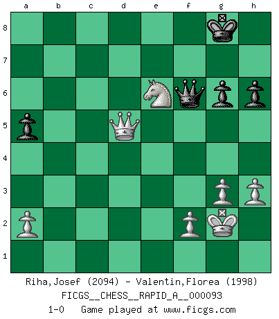 Last move : 1-0 2011 January 18 14:50:48 [Event "FICGS__CHESS__RAPID_A__000093"] [Site "FICGS"] [Date "2010.11.13"] [Round "1"] [White "Riha,Josef"] [Black "Valentin,Florea"] [Result "1-0"] [WhiteElo "2094"] [BlackElo "1998"] 1.d4 Nf6 2.c4 e6 3.Nf3 b6 4.g3 Ba6 5.b3 Bb4+ 6.Bd2 Be7 7.Nc3 O-O 8.e4 d5 9.cxd5 Bxf1 10.Kxf1 exd5 11.e5 Ne4 12.Kg2 Qd7 13.Re1 Nxc3 14.Bxc3 Nc6 15.Qd3 Nd8 16.b4 Ne6 17.Rab1 Rfb8 18.Red1 h6 19.h3 Qa4 20.Rdc1 Qd7 21.Rc2 c5 22.bxc5 bxc5 23.Rxb8+ Rxb8 24.dxc5 Bxc5 25.Bd4 Rc8 26.Bxc5 Rxc5 27.Rxc5 Nxc5 28.Qc3 Qd8 29.Qxc5 a6 30.Nd4 Kh7 31.Qc2+ Kg8 32.Qc6 a5 33.Qb7 g6 34.e6 fxe6 35.Nxe6 Qf6 36.Qxd5 1-0 Queen's Indian : Nimzovich variation (exaggerated Fianchetto) Kingside Castling by player Black (move 7) Player White won this chess game. Follow this game move after move (download)There is no remorse like the remorse of Chess. (H. G. Wells) Es gibt nur zwei wahre Schachgenies - das andere war Wilhelm Steinitz, der Weltmeister von 1872 bis 1894. (Robert James Fischer) El Ajedrez es el gimnasio de la mente. (Blaise Pascal) Il n'y a pas de prix trop élevé au scalp de l'ennemi. (Koblentz) Creativity is allowing yourself to make mistakes. Art is knowing which ones to keep. (Scott Adams)