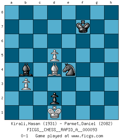 Last move : 0-1 2011 April 6 2:40:16 [Event "FICGS__CHESS__RAPID_A__000093"] [Site "FICGS"] [Date "2010.11.13"] [Round "1"] [White "Kirali,Hasan"] [Black "Parmet,Daniel"] [Result "0-1"] [WhiteElo "1931"] [BlackElo "2082"] 1.d4 Nf6 2.c4 g6 3.Nc3 Bg7 4.e4 d6 5.Nf3 O-O 6.Be2 e5 7.O-O Nc6 8.d5 Ne7 9.Ne1 Nd7 10.Be3 f5 11.f3 f4 12.Bf2 g5 13.Nd3 Nf6 14.c5 Ng6 15.Rc1 Rf7 16.a3 h5 17.Qc2 g4 18.cxd6 cxd6 19.Nb5 Ne8 20.Kh1 Bd7 21.Qb3 a6 22.Nc3 Rb8 23.a4 Qg5 24.Ne1 g3 25.Bg1 b5 26.axb5 axb5 27.Bd3 gxh2 28.Bxh2 h4 29.Ne2 Nf6 30.Qa3 Bf8 31.Qa7 Rd8 32.Rc7 Rg7 33.Qb7 Nh5 34.Rf2 h3 35.Bxb5 Ng3+ 36.Kg1 Bxb5 37.Rxg7+ Bxg7 38.Qxb5 Nh4 39.Qa5 Nxe2+ 40.Rxe2 Rc8 41.Qa1 hxg2 42.Qd1 Qd8 43.Rf2 Qb6 44.Nxg2 Qd4 45.Qxd4 Rc1+ 46.Ne1 Rxe1+ 47.Rf1 Rxf1+ 48.Kxf1 exd4 49.Bxf4 Nxf3 50.Bxd6 d3 51.Kf2 Nd2 52.Bb4 Bd4+ 53.Kg3 Nxe4+ 54.Kf3 Nc5 55.b3 Bg1 56.Kg2 Na6 57.Bc3 Bc5 58.Kf3 Bb4 59.Bd4 Nc5 60.Ke3 d2 61.Ke2 Ne4 62.Kd1 Kf7 0-1 This chess game has been lost on time (started : 2010.11.13 14:36:11) King's Indian : Orthodox, Aronin-Taimanov variation (Yugoslav attack / Mar del Plata variation) Kingside Castling by player Black (move 5) Kingside Castling by player White (move 7) 10 pieces endgame at move 49 : White KBPPP , Black KBNPP WHITE : King + 1 Bishop 3 Pawns BLACK : King + 1 Bishop 1 Knight 2 Pawns 9 pieces endgame at move 50 : White KBPPP , Black KBNP WHITE : King + 1 Bishop 3 Pawns BLACK : King + 1 Bishop 1 Knight 1 Pawn 8 pieces endgame at move 53 : White KBPP , Black KBNP WHITE : King + 1 Bishop 2 Pawns BLACK : King + 1 Bishop 1 Knight 1 Pawn Player Black won this chess game. Follow this game move after move (download)I have always a slight feeling of pity for the man who has no knowledge of Chess. (Siegbert Tarrasch) Ich habe Kasparov in Rente geschickt. (Veselin Topalov) Todo se encuentra en un estado de flujo y esto incluye al mundo del Ajedrez. (Mikhail Botvinnik) Psychologiquement, tu dois avoir confiance en toi même, mais cette confiance doit être basée sur des faits. (Robert Fischer) A person who never made a mistake never tried anything new. (Albert Einstein)