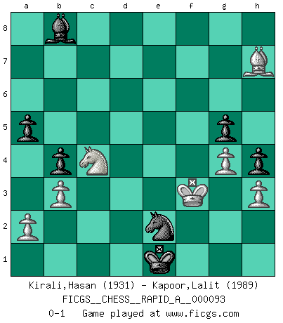 Last move : 0-1 2011 June 16 7:50:28 [Event "FICGS__CHESS__RAPID_A__000093"] [Site "FICGS"] [Date "2010.11.13"] [Round "1"] [White "Kirali,Hasan"] [Black "Kapoor,Lalit"] [Result "0-1"] [WhiteElo "1931"] [BlackElo "1989"] 1.d4 Nf6 2.c4 g6 3.Nc3 d5 4.Nf3 Bg7 5.Qb3 dxc4 6.Qxc4 O-O 7.e4 a6 8.Bf4 b5 9.Qxc7 Qxc7 10.Bxc7 Bb7 11.Bd3 b4 12.Na4 Nxe4 13.O-O Nf6 14.Rac1 Nbd7 15.Ne5 Rfc8 16.Rfe1 Bh6 17.Rc2 Nxe5 18.dxe5 Nd5 19.Be4 Rxc7 20.Rxc7 Nxc7 21.Bxb7 Rd8 22.g3 Rd2 23.Bc8 a5 24.Bg4 Bg7 25.f4 f6 26.Rc1 h5 27.Bf3 Nb5 28.exf6 Bxf6 29.Rd1 Bd4+ 30.Kh1 Rxd1+ 31.Bxd1 Kg7 32.Be2 Nd6 33.b3 e5 34.fxe5 Nf7 35.e6 Ne5 36.Kg2 Kf6 37.Bd1 Kxe6 38.h3 Kf6 39.Kf1 Ke6 40.Ke1 Kf7 41.Kf1 Kf6 42.Be2 Kf5 43.Bd1 Ke4 44.Ke2 g5 45.Bc2+ Kd5 46.Bf5 Kd6 47.g4 h4 48.Be4 Nd7 49.Bd3 Ke5 50.Kf3 Nf6 51.Bb5 Nd5 52.Bc4 Ne3 53.Bd3 Ba7 54.Nb2 Kd4 55.Bg6 Kc3 56.Nd3 Nc2 57.Ke4 Nd4 58.Bh7 Ne2 59.Kf3 Kd2 60.Ne5 Bb8 61.Nc4+ Ke1 0-1 This chess game has been lost on time (started : 2010.11.13 14:36:11) King's Indian defense, 3.Nc3 Kingside Castling by player Black (move 6) Kingside Castling by player White (move 13) Player Black won this chess game. Follow this game move after move (download)Chess is in its essence a game, in its form an art, and in its execution a science. (Baron Tassilo) Ein Schachspiel besteht aus drei Phasen: Die erste, wenn du hofftst den Vorteil zu haben, die zweite, wenn du glaubst einen Vorteil zu haben, und die dritte.... wenn du weißt Du wirst verlieren. (Savielly Grigorievitsch Tartakower) La caracteristica mas importante en la posición del Ajedrez es la actividad de las piezas. Esto es absolutamente fundamental en todas las fases del juego: Apertura, Juego Medio y especialmente Finales. La limitación primordial en la actividad de una pieza, es la estructuración de los Peones. (Michael Stean) On croit qu'il y a plus de mauvais joueurs que de bons joueurs, c'est faux : Il y a autant de joueurs qui gagnent que de joueurs qui perdent. (Philippe Geluck) If you lose the game you should win the analysis! (Proverb)
