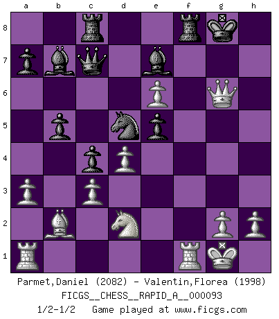 Last move : 1/2-1/2 2011 February 16 19:17:15 [Event "FICGS__CHESS__RAPID_A__000093"] [Site "FICGS"] [Date "2010.11.13"] [Round "1"] [White "Parmet,Daniel"] [Black "Valentin,Florea"] [Result "1/2-1/2"] [WhiteElo "2082"] [BlackElo "1998"] 1.d4 Nf6 2.Nf3 e6 3.c4 b6 4.a3 Bb7 5.Nc3 d5 6.cxd5 Nxd5 7.Qc2 Nxc3 8.bxc3 Be7 9.e4 O-O 10.Bd3 c5 11.O-O Qc7 12.Qe2 Nd7 13.Bb2 Rac8 14.Nd2 Nf6 15.f4 b5 16.e5 c4 17.Bc2 Nd5 18.f5 f6 19.fxe6 fxe5 20.Qh5 g6 21.Bxg6 hxg6 22.Qxg6+ Kh8 23.Qh6+ Kg8 24.Qg6+ Kh8 25.Qh6+ Kg8 26.Qg6+ 1/2-1/2 Queen's pawn game Kingside Castling by player Black (move 9) Kingside Castling by player White (move 11) This chess game ended in a draw. Follow this game move after move (download)On the chessboard, lies and hypocrisy do not survive long. (Emanuel Lasker) Stelle das Brett so, daß die Sonne in die Augen deines Gegners scheint. (Ruy López) Aquel que toma al Peón de Caballo de la Reina, se pasará la noche a dormir en la calle. (Anónimo) On a dit que l'homme se distingue de l'animal par le fait qu'il achète plus de livres qu'il ne peut en lire. Je voudrais suggérer qu'inclure à la liste des livres quelques livres d'échecs rendrait la distinction manifeste. (Edward Lasker) To steal ideas from one person is plagiarism. To steal from many is research. (Unknown)