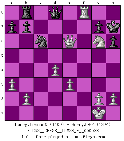 Last move : 1-0 2007 March 3 15:11:1 [Event "FICGS__CHESS__CLASS_E__000023"] [Site "FICGS"] [Date "2006.11.29"] [Round "1"] [White "Oberg,Lennart"] [Black "Herr,Jeff"] [Result "1-0"] [WhiteElo "1400"] [BlackElo "1374"] 1.c4 e5 2.Nc3 f5 3.d4 e4 4.Bf4 c6 5.Nh3 Nf6 6.e3 d5 7.cxd5 cxd5 8.Bg5 Be7 9.Bxf6 Bxf6 10.Rc1 O-O 11.Nxd5 Nc6 12.Nxf6+ Rxf6 13.Bc4+ Kh8 14.O-O Qe8 15.f3 exf3 16.Qxf3 h6 17.Nf4 Na5 18.Bd3 Nc6 19.a3 Qd8 20.Rc5 Bd7 21.Bxf5 Bxf5 22.Rxf5 Rxf5 23.Ng6+ Kg8 24.Qxf5 Rb8 25.Qe6+ Kh7 26.Rf8 1-0 English Opening Kingside Castling by player Black (move 10) Kingside Castling by player White (move 14) Player White won this chess game. Follow this game move after move (download)There are two types of sacrifices: correct ones and mine. (Mikhail Tal) Wenn sie aufgeben, dann danke ich Ihnen für das Spiel (Eventualzug beim Fernschach). (Anonymous) La pasion por jugar al Ajedrez es una de las mas inexplicables en el mundo. (H.G. Wells) Je fais ceci parce que dans cinquante coups j'obtiendrai cela; je m'appelle Mikhail Moisevitch Botvinnik. (Botvinnik) Be who you are, and say what you feel because those who mind don't matter, and those who matter don't mind. (Dr Seuss)