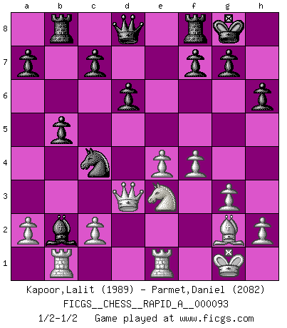 Last move : 1/2-1/2 2011 March 4 12:17:10 [Event "FICGS__CHESS__RAPID_A__000093"] [Site "FICGS"] [Date "2010.11.13"] [Round "1"] [White "Kapoor,Lalit"] [Black "Parmet,Daniel"] [Result "1/2-1/2"] [WhiteElo "1989"] [BlackElo "2082"] 1.e4 e5 2.Nc3 Nc6 3.d3 Nf6 4.g3 Bc5 5.Bg2 O-O 6.Nf3 d6 7.Be3 Be6 8.O-O Qd7 9.Qd2 h6 10.d4 exd4 11.Nxd4 Bc4 12.Rfe1 Ng4 13.Nd1 Nxe3 14.Nxe3 Bxd4 15.Nxc4 Qe6 16.Qd3 Qf6 17.Qd2 Ne5 18.Ne3 Bxb2 19.Nd5 Qg5 20.f4 Qd8 21.Rab1 Nc4 22.Qd3 b5 23.Ne3 Rb8 1/2-1/2 Vienna game, Max Lange defense Kingside Castling by player Black (move 5) Kingside Castling by player White (move 8) This chess game ended in a draw. Follow this game move after move (download)The only thing Chess players have in common is Chess. (Lodewijk Prins) Garry Kasparov war erst in der Großmeister-Organisation GMA, dann in der Profischach-Vereinigung PCA, zum Schluss kehrte er wieder in den Schoß der FIDE zurück. Aber gut, manche Leute sind flexibel (Viswanathan Anand) Repentinamente, me resultaba obvio en mi analisis que yo había pasado por alto lo que Fischer había visto en el tablero con la mas grande facilidad. (Mikhail Botvinnik) Je ne suis pas le dernier à jouer lâchement des coups douteux pendant le zeïtnot de l'adversaire pour l'achever: en effet les coups qui font le plus peur sont ceux que l'on ne comprend pas. Je me fais souvent peur quand je joue. (Un professeur anonyme) Life is like a play: it's not the length but the excellence of the acting that matters. (Seneca)