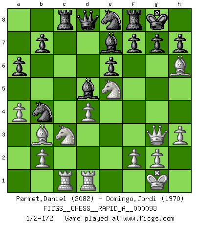 Last move : 1/2-1/2 2011 January 19 5:15:35 [Event "FICGS__CHESS__RAPID_A__000093"] [Site "FICGS"] [Date "2010.11.13"] [Round "1"] [White "Parmet,Daniel"] [Black "Domingo,Jordi"] [Result "1/2-1/2"] [WhiteElo "2082"] [BlackElo "1970"] 1.d4 d5 2.Nf3 c5 3.c4 dxc4 4.e3 Nf6 5.Bxc4 e6 6.O-O a6 7.a4 Nc6 8.Qe2 cxd4 9.Rd1 Be7 10.exd4 O-O 11.Nc3 Nb4 12.Ne5 Nfd5 13.Bb3 Bd7 14.Qg4 Nf6 15.Qg3 Bc6 16.Bh6 Ne8 17.Rac1 Rc8 18.h3 Bd5 1/2-1/2 Queen's pawn game, Krause variation Kingside Castling by player White (move 6) Kingside Castling by player Black (move 10) This chess game ended in a draw. Follow this game move after move (download)You can only get good at Chess if you love the game. (Bobby Fischer) Als ich elf wurde, wurde ich einfach gut. (Robert James Fischer) Robert Fischer es la ley hacia si mismo. (Larry Evans) Comme les marins qui ont mille raisons différentes d'aller en mer, les joueurs d'échecs en ont tout autant avant de s'installer devant une table et jouer... (Vincent Bertignac, philosophe) A woman without a man is like a fish without a bicycle. (Gloria Steinem)