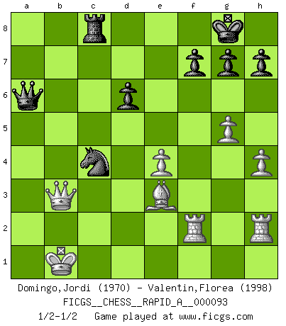 Last move : 1/2-1/2 2011 January 16 10:41:14 [Event "FICGS__CHESS__RAPID_A__000093"] [Site "FICGS"] [Date "2010.11.13"] [Round "1"] [White "Domingo,Jordi"] [Black "Valentin,Florea"] [Result "1/2-1/2"] [WhiteElo "1970"] [BlackElo "1998"] 1.e4 c5 2.Nf3 d6 3.d4 cxd4 4.Nxd4 Nf6 5.Nc3 a6 6.Be3 e5 7.Nb3 Be6 8.f3 Be7 9.Qd2 O-O 10.O-O-O Nbd7 11.g4 b5 12.g5 b4 13.Ne2 Ne8 14.f4 a5 15.f5 a4 16.Nbd4 exd4 17.Nxd4 b3 18.Kb1 bxc2+ 19.Nxc2 Bb3 20.axb3 axb3 21.Na3 Ne5 22.h4 Ra4 23.Rh3 Qa8 24.Qd5 Rxa3 25.bxa3 Qxa3 26.Rd2 Nc7 27.Qb7 Qa5 28.Qa7 Qc3 29.Qd4 Qc6 30.f6 Rc8 31.fxe7 Nb5 32.e8Q+ Qxe8 33.Bxb5 Qxb5 34.Rf2 b2 35.R3h2 Qa6 36.Qxb2 Nc4 37.Qb3 Na3+ 38.Kb2 Nc4+ 39.Kb1 Na3+ 40.Kb2 Nc4+ 41.Kb1 1/2-1/2 Sicilian : Najdorf, Byrne (English) attack Kingside Castling by player Black (move 9) Queenside Castling by player White (move 10) Promotion Queen by player White (move 32) This chess game ended in a draw. Follow this game move after move (download)Chess is life. (Bobby Fischer) Glücklicherweise sind Großmeister Ruben Fines reine Schachbücher weniger phallozentrisch [als seine Schachpsychologie] und deswegen auch weniger lächerlich. (Nigel Short) El Ajedrez era la lengua materna de Capablanca. (Reti) Si je n'étais pas joueur d'échecs, je serais le meilleur dans quelque chose d'autre. (Anatoli Karpov) Good luck. You're gonna need it. (Han Solo in Star Wars ep.6)