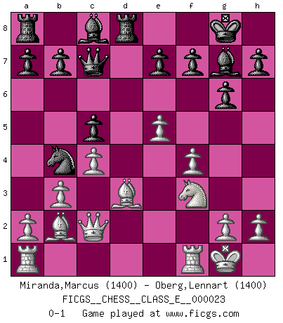 Last move : 0-1 2007 January 14 17:18:59 [Event "FICGS__CHESS__CLASS_E__000023"] [Site "FICGS"] [Date "2006.11.29"] [Round "1"] [White "Miranda,Marcus"] [Black "Oberg,Lennart"] [Result "0-1"] [WhiteElo "1400"] [BlackElo "1400"] 1.e4 d6 2.d4 Nf6 3.Nc3 g6 4.f4 Bg7 5.Nf3 O-O 6.Bd3 c5 7.dxc5 dxc5 8.e5 Nd5 9.Nxd5 Qxd5 10.c4 Qc6 11.O-O Rd8 12.Qc2 Qc7 13.b3 Nc6 14.Bb2 Nb4 0-1 Pirc : Austrian attack, 6.Bd3 Kingside Castling by player Black (move 5) Kingside Castling by player White (move 11) Player Black won this chess game. Follow this game move after move (download)Pawns are born free, yet they are everywhere in chains. (Rick Kennedy) Jeder leidlich begabte Spieler, er braucht keineswegs hervorragend veranlagt zu sein, kann es zum Meister bringen. Aber das ist ja auch gar nicht nötig! Der richtige Standpunkt ist es, zu seinem Vergnügen zu spielen, und man glaube ja nicht, dass der Genuss proportional dem Können sei. (Siegbert Tarrasch) Coloca el contenido de las piezas del Ajedrez en un sombrero, agitalo vigorosamente, arrojalas en un tablero desde una altura de 30 centimetros y así obtendras el estilo de Steinitz. (H. E. Bird) On entre au jeu d'Echecs comme on entre en Religion. Pour le joueur d'Echecs, la partie d'Echecs c'est l'office, la messe, le défilé du 1er Mai, le dépôt de gerbe au Monument aux Morts. C'est un drame sacré. (Michel Roos) If computers get too powerful, we can organize them into committees. That'll do them in. (Anonymous)