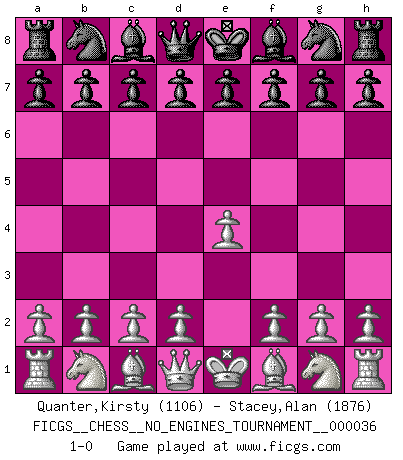 Last move : 1-0 2010 December 26 22:54:35 [Event "FICGS__CHESS__NO_ENGINES_TOURNAMENT__000036"] [Site "FICGS"] [Date "2010.11.14"] [Round "1"] [White "Quanter,Kirsty"] [Black "Stacey,Alan"] [Result "1-0"] [WhiteElo "1106"] [BlackElo "1876"] 1.e4 1-0 This chess game has been lost on time (started : 2010.11.14 14:41:38) King's pawn Opening Player White won this chess game. Follow this game move after move (download)He who fears an isolated Queen's Pawn should give up Chess. (Siegbert Tarrasch) Als er Schachweltmeister wurde ließ er praktisch alle stärksten Sovietspieler für sich arbeiten. Wenn ein auch nur mittelmässiger Meister ein Spezialist für eine bestimmte Eröffnung war, wurde er von Karpov gerufen. Das wurde alles geheim gehalten. (Mikhail Moiseyevich Botvinik) El hombre es un frívolo, una creatura engañosa y como un jugador de Ajedrez, se preocupa mas por el proceso de obtener su meta que de la meta por sí misma. (Dostoyevsky) Il s'avisa de me proposer d'apprendre les échecs qu'il jouait un peu... me voilà forcené des échecs. J'achète un échiquier, je m'enferme dans ma chambre, j'y passe des jours et des nuits à vouloir apprendre par cur toutes les parties. (Jean-Jacques Rousseau, Confessions) Whoever said the pen is mightier than the sword obviously never encountered automatic weapons. (US General Douglas MacArthur)