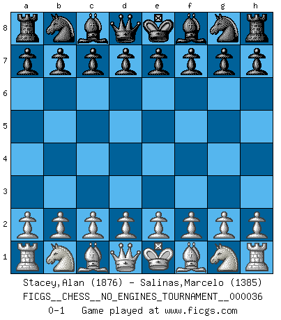 Last move : 0-1 2010 December 26 22:54:35 [Event "FICGS__CHESS__NO_ENGINES_TOURNAMENT__000036"] [Site "FICGS"] [Date "2010.11.14"] [Round "1"] [White "Stacey,Alan"] [Black "Salinas,Marcelo"] [Result "0-1"] [WhiteElo "1876"] [BlackElo "1385"] 0-1 This chess game has been lost on time (started : 2010.11.14 14:41:38) Player Black won this chess game. Follow this game move after move (download)Spassky will not be psyched out by Fischer. (Mike Goodall) Als ich elf wurde, wurde ich einfach gut. (Robert James Fischer) Ciertamente el estado mental actual de Bobby Fischer es una tragedia. Uno de los mas grandes jugadores de Ajedrez del mundo -el orgullo y pena del Ajedrez Americano. (Frank Brady) La tactique, c'est ce que vous faites quand il y a quelque chose à faire; la stratégie, c'est ce que vous faites quand il n'y a rien à faire. (Savielli Tartacower) Your best chance to get a Royal Flush in a casino is in the bathroom. (Anonymous)