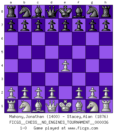 Last move : 1-0 2010 December 26 22:54:35 [Event "FICGS__CHESS__NO_ENGINES_TOURNAMENT__000036"] [Site "FICGS"] [Date "2010.11.14"] [Round "1"] [White "Mahony,Jonathan"] [Black "Stacey,Alan"] [Result "1-0"] [WhiteElo "1400"] [BlackElo "1876"] 1.e4 1-0 This chess game has been lost on time (started : 2010.11.14 14:41:38) King's pawn Opening Player White won this chess game. Follow this game move after move (download)The sign of a great Master is his ability to win a won game quickly and painlessly. (Irving Chernev) Über Karpov: Er war und ist ein Vertreter der russischen Reaktionäre. Das steckt tief in seiner Seele, wehalb ich nicht nett mit ihm umgehen kann. (Viktor Kortschnoi) ¿Se han dado cuenta de que Fischer casi nunca ha tenido piezas malas? El las intercambia y las piezas malas se quedan con sus oponenets. (Yuri Balashov) Les échecs sont un jeu par leur forme, un art par leur essence et une science par sa difficulté d'acquisition. Ils peuvent vous procurer autant de plaisir qu'un bon livre ou une belle musique, mais vous n'aurez une réelle joie que si vous arrivez à bien jouer. (Tigran Petrosian) He is a liar. I just don't know what the lie is yet. (Horatio Caine, C.S.I. Miami)