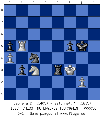 Last move : 0-1 2011 May 3 18:27:36 [Event "FICGS__CHESS__NO_ENGINES_TOURNAMENT__000036"] [Site "FICGS"] [Date "2010.11.14"] [Round "1"] [White "Cabrera,Claudio"] [Black "Satonnet,Patrick"] [Result "0-1"] [WhiteElo "1403"] [BlackElo "1613"] 1.e4 d5 2.exd5 Qxd5 3.Nc3 Qa5 4.d4 Nf6 5.Bd2 c6 6.Bd3 Bf5 7.Bxf5 Qxf5 8.Nf3 g6 9.O-O Bg7 10.Re1 O-O 11.Rxe7 Nbd7 12.Re1 Rfe8 13.h3 Rxe1+ 14.Bxe1 Re8 15.Ne2 Ne4 16.c4 Nb6 17.b3 g5 18.Nc1 h5 19.Nd3 Bf6 20.Nfe5 g4 21.hxg4 hxg4 22.Qxg4+ Qxg4 23.Nxg4 Bxd4 24.Rd1 f5 25.Ne3 Bxe3 26.fxe3 Nd7 27.Nf4 Ne5 28.Bb4 Kf7 29.a4 Rg8 30.Kf1 c5 31.Rd5 cxb4 32.Rxe5 Kf6 33.Re6+ Kg5 34.Re7 Nd2+ 35.Ke2 Nxb3 36.Rxb7 a5 37.Kf3 Nd2+ 38.Ke2 Nxc4 39.Rb5 Re8 40.Nd5 Re5 41.Kf3 b3 42.Nc3 Rxe3+ 0-1 Scandinavian (centre counter) defense Kingside Castling by player White (move 9) Kingside Castling by player Black (move 10) Player Black won this chess game. Follow this game move after move (download)Up to this point White has been following well-known analysis. But now he makes a fatal error: he begins to use his own head. (Siegbert Tarrasch) Wenn Du nicht kämpfst, um anderen etwas zu beweisen, sondern nur für Dich selbst, dann bist du fast unbesiegbar. (Garry Kasparov) El sobresalir en el Ajedrez es un signo de una mente intrigante. (Sir Arthur Conan Doyle) Toutes choses étant égales, c'est la conviction qui gagne. Alliée à une volonté de vaincre, elle sert de détonateur, suscite des idées, disperse les doutes et aide à penser clairement. (Robert Fischer) Beep ! (R2D2 in Star Wars ep.3)