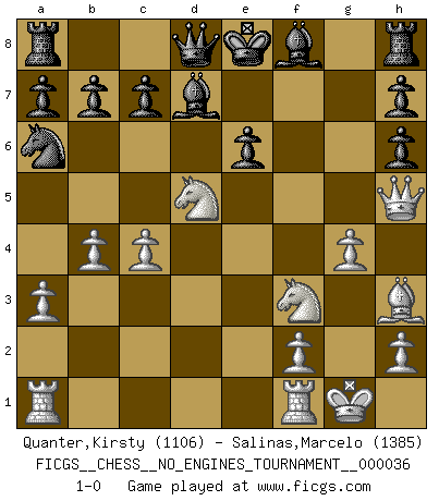 Last move : 1-0 2011 February 9 10:18:34 [Event "FICGS__CHESS__NO_ENGINES_TOURNAMENT__000036"] [Site "FICGS"] [Date "2010.11.14"] [Round "1"] [White "Quanter,Kirsty"] [Black "Salinas,Marcelo"] [Result "1-0"] [WhiteElo "1106"] [BlackElo "1385"] 1.e4 Nf6 2.e5 Nd5 3.d4 e6 4.a3 Qh4 5.c4 Ne7 6.Nc3 Nf5 7.g4 Nh6 8.Nf3 Qe7 9.Bh3 d6 10.O-O dxe5 11.dxe5 Qc5 12.Qe2 Bd7 13.b4 Qe7 14.Bg5 f6 15.Bxh6 gxh6 16.exf6 Qxf6 17.Nd5 Qd8 18.Qe5 Na6 19.Qh5+ 1-0 This chess game has been lost on time (started : 2010.11.14 14:41:38) Alekhine's defense Kingside Castling by player White (move 10) Player White won this chess game. Follow this game move after move (download)Combinations have always been the most intriguing aspect of Chess. The masters look for them, the public applauds them, the critics praise them. It is because combinations are possible that Chess is more than a lifeless mathematical exercise. They are the poetry of the game; they are to Chess what melody is to music. They represent the triumph of mind over matter. (Reuben Fine) Schach ist wie eine schöne Frau, zu der wir ständig zurückkehren, gleichviel, wie oft sie uns zurückweist. (Anonymous) Dios mío, Bobby Fischer juega tan simple. (Alexei Suetin) Les Echecs mettent en conflit, non pas deux intelligences, mais deux volontés. (Lasker) Work expands to fill the time available. (C. Northcote Parkinson, in Parkinson's Laws)