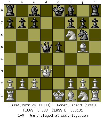 Last move : 1-0 2010 November 21 21:11:53 [Event "FICGS__CHESS__CLASS_E__000131"] [Site "FICGS"] [Date "2010.11.15"] [Round "1"] [White "Bizet,Patrick"] [Black "Gonet,Gerard"] [Result "1-0"] [WhiteElo "1339"] [BlackElo "1232"] 1.e4 Nc6 2.d4 d5 3.Nc3 dxe4 4.d5 Ne5 5.Qd4 Ng6 6.Nxe4 e5 7.Qd3 Nf6 8.Bg5 Qxd5 9.Nxf6+ 1-0 KP : Nimzovich defense, Bogolyubov variation Player White won this chess game. Follow this game move after move (download)Every Pawn is a potential Queen. (James Mason) Nur ein wirklich starker Spieler weiß wie schwach er spielt. (Savielly Grigorievitsch Tartakower) Todos los jugadores de Ajedrez deberían tener un pasatiempo. (Savielly Tartakower) Vouloir jouer aux échecs contre soi-même est aussi paradoxal que vouloir marcher sur son ombre. (Stefan Zweig) He who laughs last probably does not get the joke. (Unknown)