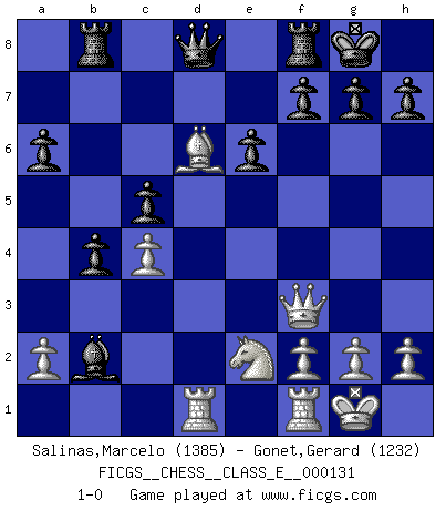 Last move : 1-0 2011 January 16 21:5:14 [Event "FICGS__CHESS__CLASS_E__000131"] [Site "FICGS"] [Date "2010.11.15"] [Round "1"] [White "Salinas,Marcelo"] [Black "Gonet,Gerard"] [Result "1-0"] [WhiteElo "1385"] [BlackElo "1232"] 1.e4 Nc6 2.Qf3 Nf6 3.Ne2 d6 4.Nbc3 Ne5 5.Qe3 c5 6.Nf4 a6 7.Ncd5 Nfg4 8.Qb3 b5 9.c4 e6 10.Ne3 b4 11.Nxg4 Nxg4 12.Be2 Nf6 13.O-O Be7 14.Bf3 Bb7 15.d4 O-O 16.e5 Bxf3 17.exf6 Bxf6 18.Qxf3 Bxd4 19.Ne2 Be5 20.Bf4 Bxb2 21.Rad1 Rb8 22.Bxd6 1-0 KP : Nimzovich defense Kingside Castling by player White (move 13) Kingside Castling by player Black (move 15) Player White won this chess game. Follow this game move after move (download)There is no remorse like the remorse of Chess. (H. G. Wells) Du kannst im Schach nur gut werden, wenn du das Spiel liebst. (Robert James Fischer) El jugador blanco perdió porque fallo en recordar la coreccta continuación y tuvo que pensar por sí mismo las movidas. (Siegbert Tarrasch) Les échecs sont un jeu par leur forme, un art par leur essence et une science par sa difficulté d'acquisition. Ils peuvent vous procurer autant de plaisir qu'un bon livre ou une belle musique, mais vous n'aurez une réelle joie que si vous arrivez à bien jouer. (Tigran Petrosian) Wisdom begins at the end. (Daniel Webster)
