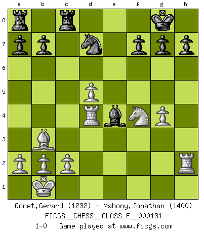 Last move : 1-0 2011 January 29 23:39:8 [Event "FICGS__CHESS__CLASS_E__000131"] [Site "FICGS"] [Date "2010.11.15"] [Round "1"] [White "Gonet,Gerard"] [Black "Mahony,Jonathan"] [Result "1-0"] [WhiteElo "1232"] [BlackElo "1400"] 1.f4 e5 2.e4 exf4 3.Bc4 Nf6 4.Nc3 c6 5.Bb3 d5 6.exd5 cxd5 7.d4 Bd6 8.Nge2 O-O 9.Bxf4 Bxf4 10.Nxf4 Re8+ 11.Nfe2 Ng4 12.Nxd5 Be6 13.h3 Bxd5 14.hxg4 Bxg2 15.Rh2 Bf3 16.Qd3 Be4 17.Qc4 Bg6 18.O-O-O Qg5+ 19.Kb1 Nd7 20.d5 Rec8 21.Qf4 Qxf4 22.Nxf4 Be4 23.Rd4 1-0 Bird : From gambit Kingside Castling by player Black (move 8) Queenside Castling by player White (move 18) Player White won this chess game. Follow this game move after move (download)You need not play well - just help your opponent to play badly. (Genrikh Chepukaitis) Ich verachte Kasparow. (Viktor Kortschnoi) Bobby es la celebridad menos entendida y malinterpretada que camina el la faz de esta tierra. (Yasser Seirawan) Le génie consiste à savoir transgresser les règles au moment opportun. (Teichmann) True nature is revealed in times of difficulty. (Chinese proverb)