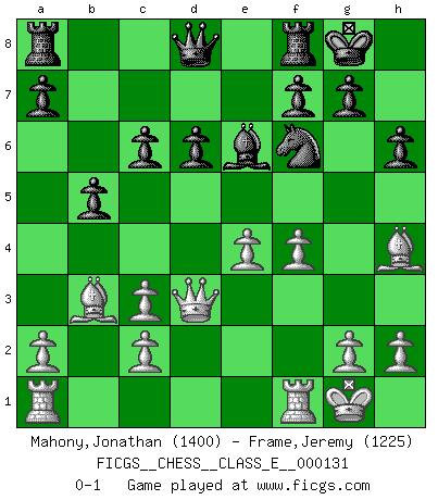 Last move : 0-1 2011 January 29 23:39:8 [Event "FICGS__CHESS__CLASS_E__000131"] [Site "FICGS"] [Date "2010.11.15"] [Round "1"] [White "Mahony,Jonathan"] [Black "Frame,Jeremy"] [Result "0-1"] [WhiteElo "1400"] [BlackElo "1225"] 1.e4 e5 2.Nf3 Nf6 3.Nc3 Nc6 4.Bb5 Bc5 5.O-O O-O 6.Nxe5 Nxe5 7.d4 Bd6 8.dxe5 Bxe5 9.Bg5 Bxc3 10.bxc3 c6 11.Bc4 h6 12.Bh4 d6 13.f4 b5 14.Bb3 Bg4 15.Qd3 Be6 0-1 Petrov Three knights game Kingside Castling by player White (move 5) Kingside Castling by player Black (move 5) Player Black won this chess game. Follow this game move after move (download)I thought the most common mistake [in chess] was the first one: Learning the game :P (Garvin Gray, FICGS forum) Ein typischer, sehr verbreiteter Gedankenschädling ist der, daß der betreffende Amateur von der Annanhme ausgeht, daß jeder einzelne Zug etwas zu leisten habe. (Aaron Nimzowitsch) El ganador de una partida es aquel jugador que hace el penúltimo error. (Savielly Tartakover) J'ai vu le vaincu d'Echecs jouer des années durant dans l'espoir de la fête de la victoire. Car tu es plus riche de ce qu'elle existe si même elle n'est point pour toi. Ainsi de la perle du fond des mers. (Antoine de Saint-Exupéry) There are two major products that came out of Berkeley: LSD and UNIX. We do not believe this is to be a coincidence. (Jeremy S. Anderson)