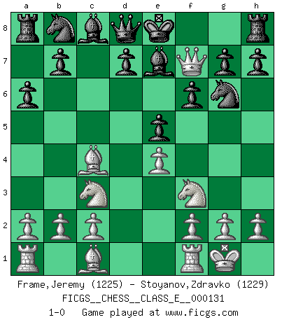 Last move : 1-0 2010 November 18 7:16:40 [Event "FICGS__CHESS__CLASS_E__000131"] [Site "FICGS"] [Date "2010.11.15"] [Round "1"] [White "Frame,Jeremy"] [Black "Stoyanov,Zdravko"] [Result "1-0"] [WhiteElo "1225"] [BlackElo "1229"] 1.e4 c5 2.Nf3 a6 3.d4 cxd4 4.Nxd4 e5 5.Nf3 f6 6.Bc4 Ne7 7.Nc3 Ng6 8.O-O Bc5 9.Qd5 Be7 10.Qf7+ 1-0 Sicilian : O'Kelly variation Kingside Castling by player White (move 8) Player White won this chess game. Follow this game move after move (download)By the beauty of his games, the clarity of his play, and the brilliance of his ideas, Fischer made himself an artist of the same stature as Brahms, Rembrandt, and Shakespeare. (David Levy) Pläne sind die Träume des Verständigen. (Ernst Freiherr von Feuchtersleben) Yo creo que el Ajedrez posee una magia que es también una ayuda en la edad avanzada. Una rodilla reumática es olvidada durante una partida de Ajedrez y otros eventos pueden parecer algo sin importancia comparada a una catástrofe en el tablero de Ajedrez. (Vlastimil Hort) A ce moment-là, je menaçais de comprendre la position ! (Clément L'Heureux) Be who you are, and say what you feel because those who mind don't matter, and those who matter don't mind. (Dr Seuss)