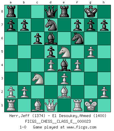 Last move : 1-0 2007 February 11 15:57:33 [Event "FICGS__CHESS__CLASS_E__000023"] [Site "FICGS"] [Date "2006.11.29"] [Round "1"] [White "Herr,Jeff"] [Black "El Desoukey,Ahmed"] [Result "1-0"] [WhiteElo "1374"] [BlackElo "1400"] 1.d4 d5 2.c4 c6 3.e3 Nf6 4.Nf3 Bf5 5.Nc3 e6 6.cxd5 exd5 7.Be2 Bd6 8.Ne5 O-O 9.f4 Re8 10.O-O Nbd7 11.g4 Be4 12.g5 1-0 QGD Slav defense Kingside Castling by player Black (move 8) Kingside Castling by player White (move 10) Player White won this chess game. Follow this game move after move (download)Blessed be the memory of him who gave the world this immortal game. (A. G. Gardiner) Smyslow ist ein Beweis dafür, dass ich noch zehn Jahre spielen kann! [der 75 jährige über den 85 jährigen] (Viktor Kortschnoi) Fischer sacrificó virtualmente todo lo que la mayoría de nosotros los 'debiles' (término que él usa) valoramos, respetamos y apreciamos por el amor de un astuto, a menudo hermoso tablero de juego, por el privilegio ambivalente de ser su mas grande maestro. (Paul Kollar) La victoire dans une partie d'Echecs appartient la plupart du temps à celui qui voit un peu plus loin que l'adversaire. (Lasker) A good book on your shelf is a friend that turns its back on you and remains a friend. (Author unknown)