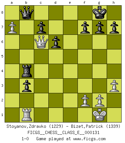 Last move : 1-0 2011 January 28 21:47:56 [Event "FICGS__CHESS__CLASS_E__000131"] [Site "FICGS"] [Date "2010.11.15"] [Round "1"] [White "Stoyanov,Zdravko"] [Black "Bizet,Patrick"] [Result "1-0"] [WhiteElo "1229"] [BlackElo "1339"] 1.e4 e5 2.Nf3 Nc6 3.a3 Nf6 4.Bb5 Bc5 5.Nc3 d6 6.Bxc6+ bxc6 7.h3 a5 8.O-O O-O 9.d3 a4 10.Re1 Ne8 11.Be3 Bxe3 12.Rxe3 Nf6 13.b3 axb3 14.cxb3 Re8 15.d4 exd4 16.Nxd4 c5 17.Nf3 Bb7 18.a4 Nxe4 19.Nxe4 Rxe4 20.Rxe4 Bxe4 21.Nd2 Bd5 22.Rb1 Qg5 23.Nf3 Bxf3 24.Qxf3 Rb8 25.Qc6 Qd8 26.Qd5 Rb4 27.a5 Qb8 28.a6 c4 29.Qc6 cxb3 30.a7 1-0 King's pawn game Kingside Castling by player White (move 8) Kingside Castling by player Black (move 8) Player White won this chess game. Follow this game move after move (download)Some sacrifices are sound; the rest are mine. (Mikhail Tal) Woher wissen wir, daß der Neanderthaler Blindschach gespielt hat? -- Bei Ausgrabungen wurden keine Schachbretter und Figuren gefunden. (Anonymous) Una buena ofensiva y una buena defensa, comienzan ambas con un buen desarrollo. (Bruce A. Moon) Mon pion favori sur ma case favorite ! Bronstein en parlant d'un coup de pion en h5 quand il avait les Noirs. Everybody lies. (Gregory House, House M.D.)