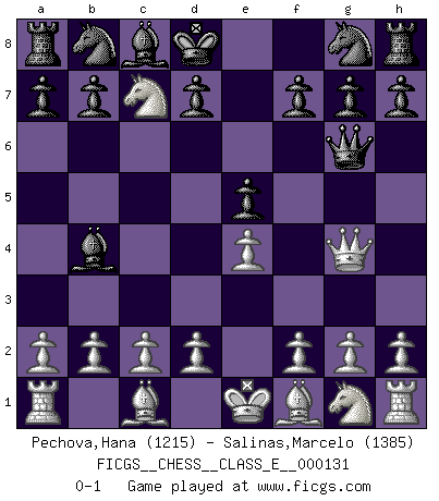 Last move : 0-1 2011 January 18 12:53:41 [Event "FICGS__CHESS__CLASS_E__000131"] [Site "FICGS"] [Date "2010.11.15"] [Round "1"] [White "Pechova,Hana"] [Black "Salinas,Marcelo"] [Result "0-1"] [WhiteElo "1215"] [BlackElo "1385"] 1.e4 e5 2.Nc3 Bb4 3.Qg4 Qf6 4.Nd5 Qg6 5.Nxc7+ Kd8 0-1 Vienna game Player Black won this chess game. Follow this game move after move (download)A good sacrifice is one that is not necessarily sound but leaves your opponent dazed and confused. (Rudolph Spielmann) Ich würde mich als ganz normalen Jungen bezeichnen [Im Alter von 12]. (Sergej Karjakin) El Ajedrez es tan inspirador que yo no creo que un buen jugador sea capaz de tener un pensamiento malo durante una partida. (Wilhelm Steinitz) Pour se monter efficace, un Cavalier a besoin d'avant-postes ! Les Cavaliers font les meilleurs bloqueurs de pions passés. Waiting for chance ? Play in casinos. (FICGS proverb)