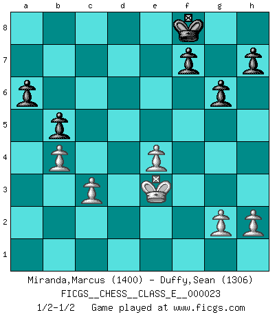 Last move : 1/2-1/2 2007 February 19 18:6:4 [Event "FICGS__CHESS__CLASS_E__000023"] [Site "FICGS"] [Date "2006.11.29"] [Round "1"] [White "Miranda,Marcus"] [Black "Duffy,Sean"] [Result "1/2-1/2"] [WhiteElo "1400"] [BlackElo "1306"] 1.e4 e5 2.Nf3 Nc6 3.Bb5 a6 4.Ba4 Nf6 5.O-O Be7 6.Re1 O-O 7.d4 b5 8.Bb3 exd4 9.Nxd4 Nxd4 10.Qxd4 d6 11.c3 c5 12.Qd1 Bb7 13.Bc2 Qb6 14.Bg5 Rfe8 15.Nd2 Nd7 16.Qh5 Bxg5 17.Qxg5 Re5 18.Qg3 Rae8 19.Re3 Nf6 20.Rae1 c4 21.b3 cxb3 22.axb3 Qa5 23.f3 d5 24.Qf2 dxe4 25.b4 Qa2 26.Bxe4 Nxe4 27.Nxe4 Qxf2+ 28.Kxf2 Bxe4 29.Rxe4 Rxe4 30.Rxe4 Rxe4 31.fxe4 g6 32.Ke3 Kf8 1/2-1/2 Ruy Lopez : Closed defense Kingside Castling by player White (move 5) Kingside Castling by player Black (move 6) This chess game ended in a draw. Follow this game move after move (download)Fischer wanted to give the Russians a taste of their own medicine. (Larry Evans) Ich las kürzlich ein Buch von Nietzsche. Er sagte Religion verdumme nur die Menschen. Ich stimme zu. (Robert James Fischer) La táctica fluye a partir de una posición superior. (Bobby Fischer) Avec des compensations pour le matériel en plus... (Anonyme) All battles are fought by scared men who'd rather be someplace else. (John Wayne in the movie In harm's way)