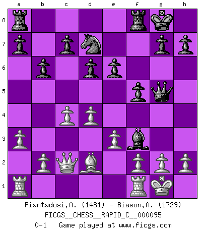 Last move : 0-1 2010 December 11 21:50:28 [Event "FICGS__CHESS__RAPID_C__000095"] [Site "FICGS"] [Date "2010.11.16"] [Round "1"] [White "Piantadosi,Angelo"] [Black "Biason,Adriano"] [Result "0-1"] [WhiteElo "1481"] [BlackElo "1729"] 1.d4 Nf6 2.c4 e6 3.Nc3 Bb4 4.Qc2 O-O 5.a3 Bxc3+ 6.Qxc3 b6 7.Nf3 Bb7 8.e3 d6 9.Be2 Nbd7 10.O-O Ne4 11.Qc2 f5 12.Nd2 Qg5 13.Bf3 Nxd2 14.Bxd2 Bxf3 0-1 Nimzo-Indian : Classical variation Kingside Castling by player Black (move 4) Kingside Castling by player White (move 10) Player Black won this chess game. Follow this game move after move (download)Chess books should be used as we use glasses: to assist the sight, although some players make use of them as if they thought they conferred sight. (Jose Raul Capablanca) Schach ist wie eine schöne Frau, zu der wir ständig zurückkehren, gleichviel, wie oft sie uns zurückweist. (Anonymous) Un juego de Ajedrez es un dialogo, una conversación entre un jugador y su oponente. Cada movimiento del oponente puede contener amenazas o tropiezos, pero un jugador no se puede defender de las amenazas o tomar ventaja de los tropiezos si es que no se pregunta a sí mismo: ¿Que es lo que mi oponente va a hacer después de cada movida?. (Bruce A. Moon) 'L'échange des dames est un coup dur pour les deux adversaires...' Un journaliste lors d'une partie du match Spassky-Fischer Begin at the beginning and go on till you come to the end; then stop. (Lewis Carrol, Alice in Wonderland)