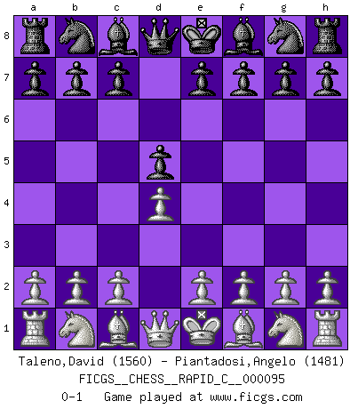 Last move : 0-1 2011 March 17 0:20:52 [Event "FICGS__CHESS__RAPID_C__000095"] [Site "FICGS"] [Date "2010.11.16"] [Round "1"] [White "Taleno,David"] [Black "Piantadosi,Angelo"] [Result "0-1"] [WhiteElo "1560"] [BlackElo "1481"] 1.d4 d5 0-1 Queen's pawn game Player Black won this chess game. Follow this game move after move (download)There are tough players and nice guys, and I'm a tough player. (Bobby Fischer) Es genügt nicht ein guter Spieler zu sein, man muß auch gut spielen. (Siegbert Tarrasch) El Ajedrez es parte de una cultura y si una cultura esta en decadencia, entonces también el Ajedrez declinará. (Mikhail Botvinnik) J'ai toujours senti une vague pitié pour l'homme qui ne connaît rien aux échecs, tout comme j'en aurais pour un homme ignorant de l'amour. Les Echecs, comme la musique ou comme l'amour, ont le pouvoir de rendre heureux. (Siegbert Tarrasch) Live, lose, and learn, by observing your opponent how to win. (Amber Steenbock)