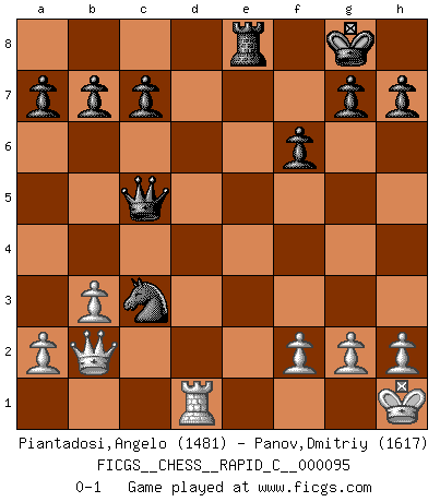 Last move : 0-1 2011 January 6 16:37:15 [Event "FICGS__CHESS__RAPID_C__000095"] [Site "FICGS"] [Date "2010.11.16"] [Round "1"] [White "Piantadosi,Angelo"] [Black "Panov,Dmitriy"] [Result "0-1"] [WhiteElo "1481"] [BlackElo "1617"] 1.b3 e5 2.Bb2 f6 3.d4 exd4 4.Bxd4 d5 5.Nf3 Nc6 6.Bb2 Bb4+ 7.Bc3 Nge7 8.Bxb4 Nxb4 9.c3 Nbc6 10.e3 Bf5 11.Bd3 Qd7 12.O-O Rd8 13.Bxf5 Nxf5 14.Nbd2 O-O 15.e4 dxe4 16.Nxe4 Rfe8 17.Nc5 Qe7 18.Qc2 Qxc5 19.Rad1 Nfd4 20.Nxd4 Nxd4 21.Qb2 Ne2+ 22.Kh1 Rxd1 23.Rxd1 Nxc3 0-1 Nimzovich-Larsen attack : Modern variation Kingside Castling by player White (move 12) Kingside Castling by player Black (move 14) Player Black won this chess game. Follow this game move after move (download)Discovered check is the dive bomber of the Chessboard. (Reuben Fine) Meine Liebe ist Schach, Schach, Schach. Ich muss jeden Tag Schach spielen, deshalb fühle ich mich so stark. (Miguel Najdorf) No soy una persona materialista y por eso, no resiento la falta o pérdida del dinero. La ausencia de cosas mundanas carece de importancia. Ya que el Ajedrez es una forma en la que puedo ser tan materialista como yo desee sin tener la necesidad de vender mi alma. (Jamie Walter Adams) Votre prénom est 'Tactique', votre deuxième prénom est 'Tactique' et votre nom est 'Tactique'. (Ken Smith) The Internet is so big, so powerful and pointless that for some people it is a complete substitute for life. (Andrew Brown)
