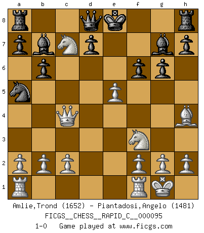 Last move : 1-0 2011 January 3 19:41:26 [Event "FICGS__CHESS__RAPID_C__000095"] [Site "FICGS"] [Date "2010.11.16"] [Round "1"] [White "Amlie,Trond"] [Black "Piantadosi,Angelo"] [Result "1-0"] [WhiteElo "1652"] [BlackElo "1481"] 1.e4 e5 2.Nf3 Nc6 3.Bb5 g6 4.d4 exd4 5.Bg5 f6 6.Bh4 Bg7 7.O-O Nge7 8.Bc4 Na5 9.Qxd4 Nxc4 10.Qxc4 b6 11.Nc3 Nc6 12.Nd5 Bb7 13.e5 Na5 14.Nxc7+ 1-0 Ruy Lopez : Fianchetto (Smyslov/Barnes) defense Kingside Castling by player White (move 7) Player White won this chess game. Follow this game move after move (download)Chess opens and enriches your mind. (Saudin Robovic) Am wohlsten fühle ich mich, wenn ich sehe, wie sich mein Gegner im Todeskampf windet. (Robert James Fischer) Uno por uno, yo los acribillé, mi superioridad muy pronto se volvio aparente. (Jose Capablanca) Si le désir cupide (et stupide) de gagner est une inépuisable source de souffrance, une combinaison brillante sur l'échiquier est une découverte : le coquelicot qui s'épanouit lorsque apparaît la Voie Lactée. (Arrabal) There are more things in heaven and earth than practically anywhere else. (Unknown)