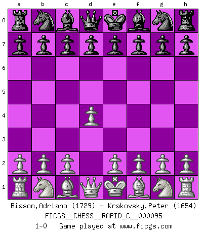 Last move : 1-0 2010 December 16 22:35:49 [Event "FICGS__CHESS__RAPID_C__000095"] [Site "FICGS"] [Date "2010.11.16"] [Round "1"] [White "Biason,Adriano"] [Black "Krakovsky,Peter"] [Result "1-0"] [WhiteElo "1729"] [BlackElo "1654"] 1.d4 1-0 This chess game has been lost on time (started : 2010.11.16 13:56:55) Queen's pawn Player White won this chess game. Follow this game move after move (download)A player surprised is half beaten. (Proverb) Im Schach gibt es keinen Platz für Galanterie. (Irving Chernev) Un buen jugador siempre tiene buena suerte. (José Raúl Capablanca) J'ai vu le vaincu d'Echecs jouer des années durant dans l'espoir de la fête de la victoire. Car tu es plus riche de ce qu'elle existe si même elle n'est point pour toi. Ainsi de la perle du fond des mers. (Antoine de Saint-Exupéry) Those parts of the system that you can hit with a hammer (not advised) are called hardware; those program instructions that you can only curse at are called software. (Anonymous)