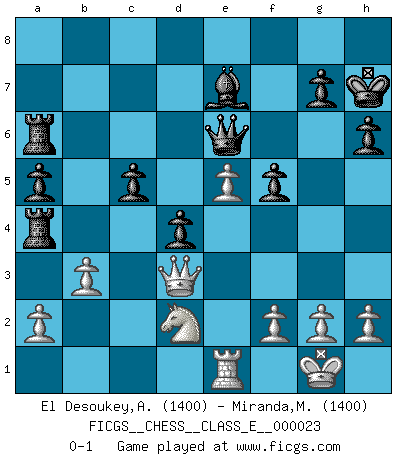 Last move : 0-1 2007 February 7 9:16:45 [Event "FICGS__CHESS__CLASS_E__000023"] [Site "FICGS"] [Date "2006.11.29"] [Round "1"] [White "El Desoukey,Ahmed"] [Black "Miranda,Marcus"] [Result "0-1"] [WhiteElo "1400"] [BlackElo "1400"] 1.d4 d5 2.Nf3 Nf6 3.Bf4 e6 4.e3 Bd6 5.Be5 Nc6 6.Bb5 O-O 7.Bxc6 bxc6 8.Qd3 h6 9.O-O a5 10.Nbd2 Ng4 11.Rfc1 Nxe5 12.dxe5 Be7 13.c4 f6 14.cxd5 cxd5 15.Qg6 c5 16.e4 d4 17.Nc4 Ba6 18.Qg4 Bxc4 19.Rxc4 Qb6 20.b3 f5 21.exf5 exf5 22.Qh5 Qe6 23.Re1 Kh7 24.Ra4 Rfb8 25.Nd2 Rb4 26.Qf3 Ra6 27.Qd3 Rxa4 0-1 Queen's Bishop game Kingside Castling by player Black (move 6) Kingside Castling by player White (move 9) Player Black won this chess game. Follow this game move after move (download)It is not a move, even the best move that you must seek, but a realizable plan. (Eugene Znosko-Borovsky) Ich habe Kasparov in Rente geschickt. (Veselin Topalov) Uno no tiene que jugar muy bien, es suficiente jugar mejor que el oponente. (Siegbert Tarrasch) Roi des jeux et jeu des rois, les échecs portent en eux un sentiment d'infini. Ils donnent à celui qui s'est efforcé d'en approfondir les arcanes l'impression de n'être pas à la mesure de l'homme; en fait, ils constituent un résumé de l'univers, un microcosme, et figurent cette grande échelle qui, dans les plans de la lumière descend jusqu'à la matière, qui des abîmes insondables remonte jusqu'en l'infini de Dieu. (Pyrame) Sometimes it pays to stay in bed in Monday, rather than spending the rest of the week debugging Monday's code. (Dan Salomon)