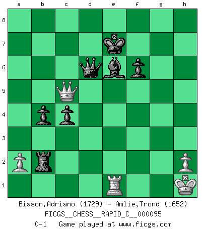 Last move : 0-1 2011 March 31 22:40:20 [Event "FICGS__CHESS__RAPID_C__000095"] [Site "FICGS"] [Date "2010.11.16"] [Round "1"] [White "Biason,Adriano"] [Black "Amlie,Trond"] [Result "0-1"] [WhiteElo "1729"] [BlackElo "1652"] 1.d4 Nf6 2.c4 e6 3.Nf3 d5 4.Nc3 c6 5.Bg5 h6 6.Bh4 dxc4 7.e4 g5 8.Bg3 b5 9.Be2 Bb7 10.O-O Nbd7 11.Ne5 h5 12.Nxd7 Qxd7 13.Be5 Rh6 14.Qc1 c5 15.dxc5 b4 16.Qxg5 Rg6 17.Qf4 Ng4 18.Rad1 Qc6 19.Nd5 exd5 20.exd5 Qxc5 21.Rfe1 Bh6 22.Qf5 Kf8 23.Bxg4 hxg4 24.Bd4 Qd6 25.Be5 Qa6 26.Qd7 Kg8 27.Bd4 Rd6 28.Qxg4+ Rg6 29.Qd7 Rf8 30.Be3 Bg7 31.Bc5 Bc8 32.Qc7 Bh3 33.Bxf8 Rxg2+ 34.Kh1 Qg6 35.Re8 Bxf8 36.Qe5 Rxf2 37.Rxf8+ Kxf8 38.Qh8+ Ke7 39.Re1+ Be6 40.d6+ Kd7 41.Qa8 Rxb2 42.Qxa7+ Kxd6 43.Qb6+ Ke7 44.Qc5+ Kd7 45.Qb5+ Kd8 46.Qa5+ Ke8 47.Qa8+ Ke7 48.Qd5 Qd3 49.Qg5+ f6 50.Qc5+ Qd6 0-1 Queen's pawn game Kingside Castling by player White (move 10) Player Black won this chess game. Follow this game move after move (download)Bobby is the finest Chess player this country ever produced. His memory for the moves, his brilliance in dreaming up combinations, and his fierce determination to win are uncanny. (John Collins) Nur ein wirklich starker Spieler weiß wie schwach er spielt. (Savielly Grigorievitsch Tartakower) Sin errores no puede haber brillantez. (Emanuel Lasker) Mais n'est-ce pas déjà le limiter injurieusement que d'appeler les échecs un jeu? N'est-ce pas aussi une science, un art, ou quelque chose qui, comme le cercueil de Mahomet entre ciel et terre, est suspendu entre l'un et l'autre, et qui réunit un nombre incroyable de contraires ? (Stefan Zweig) Treat your password like your toothbrush. Don't let anybody else use it, and get a new one every six months. (Clifford Stoll)