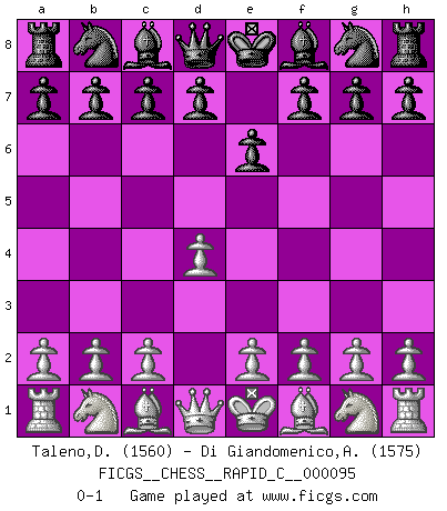 Last move : 0-1 2011 March 19 12:29:38 [Event "FICGS__CHESS__RAPID_C__000095"] [Site "FICGS"] [Date "2010.11.16"] [Round "1"] [White "Taleno,David"] [Black "Di Giandomenico,Alfonso"] [Result "0-1"] [WhiteElo "1560"] [BlackElo "1575"] 1.d4 e6 0-1 This chess game has been lost on time (started : 2010.11.16 13:56:55) Queen's pawn Player Black won this chess game. Follow this game move after move (download)The hardest game to win is a won game. (Emanuel Lasker) Ich bin es gewohnt, das die Jugend mir überhaupt keinen Respekt entgegenbringt. (Alexander Morozewich) Yo no creo en la psicología. Yo creo en las buenas movidas. (Bobby Fischer) Echiquier : carré parfait, comme la Jérusalem nouvelle décrite par l'auteur de l'Apocalypse, huit cases sur huit, exaltation du chiffre 4, symbole du cosmos aux quatre horizons... où le noir et le blanc, l'ombre et la lumière, le mal et le bien s'entremêlent et se conjuguent. (Robert Couffignal, Le Gambit du poète) Inventor: A person who makes an ingenious arrangement of wheels, levers and springs, and believes it civilization. (Ambrose Bierce, The Devil's Dictionary)