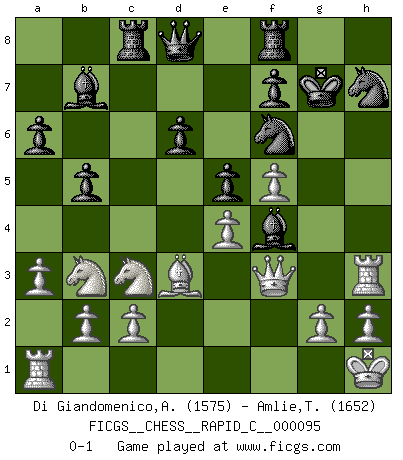 Last move : 0-1 2011 February 15 14:49:14 [Event "FICGS__CHESS__RAPID_C__000095"] [Site "FICGS"] [Date "2010.11.16"] [Round "1"] [White "Di Giandomenico,Alfonso"] [Black "Amlie,Trond"] [Result "0-1"] [WhiteElo "1575"] [BlackElo "1652"] 1.e4 c5 2.Nf3 d6 3.d4 cxd4 4.Nxd4 Nf6 5.Nc3 a6 6.Bd3 e5 7.Nb3 Be7 8.O-O O-O 9.Kh1 Be6 10.f4 b5 11.f5 Bc8 12.a3 Bb7 13.Bg5 Nbd7 14.Qe1 Rc8 15.Qh4 h6 16.Bxh6 gxh6 17.Qxh6 Nh7 18.Rf3 Bg5 19.Rg3 Kh8 20.Qh5 Ndf6 21.Qf3 Bf4 22.Rh3 Kg7 0-1 Sicilian : Najdorf Kingside Castling by player White (move 8) Kingside Castling by player Black (move 8) Player Black won this chess game. Follow this game move after move (download)Weak points or holes in the opponent's position must be occupied by pieces not Pawns. (Siegbert Tarrasch) Jeder weiß, dass Gasprom Putins persönliches Machtinstrument ist. Die Firma wird vom Kreml aus geleitet und wird schon deshalb nie transparent sein. (Garry Kasparov) Mi estilo es algo parecido entre un poco de Tal y Petrosian. (Reshevsky) Ne tendez aucun piège pour le plaisir ! Ne jouez rien dans l'espoir que l'adversaire réagisse de façon stupide ! Prenez toujours pour acquis que l'adversaire va trouver le meilleur coup ! Ne jouez jamais de coup dans l'espoir que l'adversaire ne voie pas la menace ! Chacun de vos coups doit améliorer la position d'une façon ou d'une autre. If you are going through hell, keep going. (Winston Churchill)