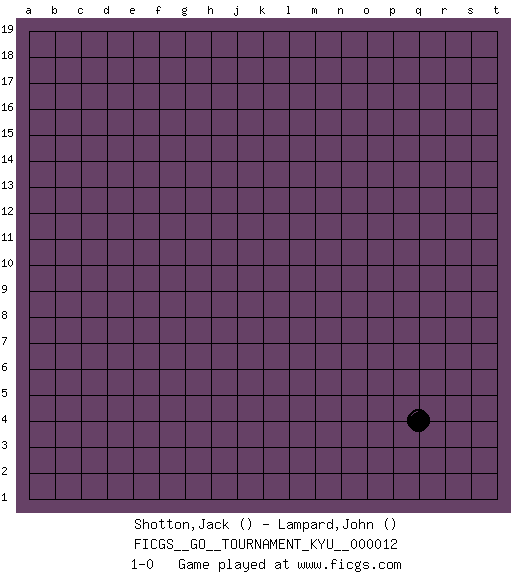 Last move : 1-0 2006 December 29 20:51:24 [Event "FICGS__GO__TOURNAMENT_KYU__000012"] [Site "FICGS"] [Date "2006.11.29"] [Round "1"] [Black "Shotton,Jack"] [White "Lampard,John"] [Result "1-0"] 1.q4 1-0 This go game has been lost on time (started : 2006.11.29 15:20:31) Here are the names of the openings (joseki) played in the four corners : Corner q4 : q4 1-0 Hoshi (Hwajeom, Seongjeom, Xingwei`) 4-4 Point. The star or hoshi (4-4) point, emphasizing influence at the potential expense of territory. Player Black won this Go (weiqi, baduk) game. Follow this game move after move (download)If White takes all four corners, Black should resign; if Black takes all four corners, Black should also resign. (David Kent) I would love to change the world, but they won't give me the source code. (Unknown)