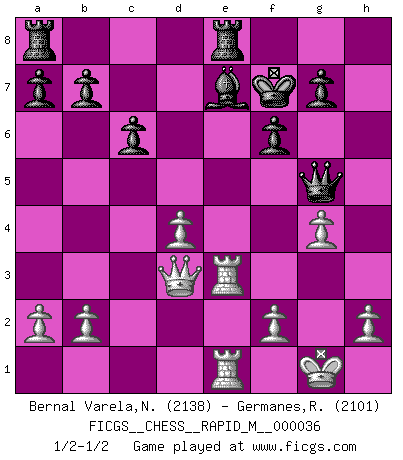 Last move : 1/2-1/2 2011 January 8 14:43:35 [Event "FICGS__CHESS__RAPID_M__000036"] [Site "FICGS"] [Date "2010.11.16"] [Round "1"] [White "Bernal Varela,Nelson"] [Black "Germanes,Ramil"] [Result "1/2-1/2"] [WhiteElo "2138"] [BlackElo "2101"] 1.e4 e5 2.Nf3 Nf6 3.Nxe5 d6 4.Nf3 Nxe4 5.d4 d5 6.Bd3 Nc6 7.O-O Be7 8.c4 Nb4 9.cxd5 Nxd3 10.Qxd3 Qxd5 11.Re1 Bf5 12.g4 Bg6 13.Nc3 Nxc3 14.Qxc3 f6 15.Nh4 Kf8 16.Bf4 c6 17.Re3 Kf7 18.Rae1 Rhe8 19.Nxg6 hxg6 20.Qd3 g5 21.Bxg5 Qxg5 1/2-1/2 Petrov : Classical attack Kingside Castling by player White (move 7) This chess game ended in a draw. Follow this game move after move (download)Only sissies Castle. (Rob Sillars) Du weisst es gibt ein Problem mit Computern und Fernschach, wenn jeder eine Rating von 2450 hat. (John Christen Knudsen) Bobby solo arroja las piezas y solas caen en las casillas correctas. (Miguel Najdorf ) Des combinaisons [dans le jeu d'échecs] pareilles à des mélodies. Je crois entendre pour ainsi dire la musique des coups... (Vladimir Nabokov) Gambling is the son of avarice and the father of despair. (French proverb)