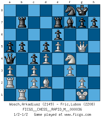 Last move : 1/2-1/2 2011 May 12 22:15:22 [Event "FICGS__CHESS__RAPID_M__000036"] [Site "FICGS"] [Date "2010.11.16"] [Round "1"] [White "Wosch,Arkadiusz"] [Black "Fric,Lubos"] [Result "1/2-1/2"] [WhiteElo "2149"] [BlackElo "2208"] 1.e4 e6 2.d4 d5 3.Nc3 Bb4 4.e5 c5 5.a3 Bxc3+ 6.bxc3 Ne7 7.Qg4 O-O 8.Bd3 c4 9.Bh6 Ng6 10.Bxg6 fxg6 11.Bd2 Qe8 12.Ne2 Qa4 13.Ra2 Rf7 14.f3 b6 15.Kf2 Nd7 16.Nf4 Nf8 17.h4 Bd7 18.h5 gxh5 19.Nxh5 Kh8 20.Bg5 Be8 21.Be3 Rc8 22.Nf4 Rc6 23.Kg3 a5 24.Qh5 Kg8 25.Kf2 b5 26.Rb1 Re7 27.Qg5 R6c7 28.Kg1 Bf7 29.Bd2 Rb7 1/2-1/2 French : Winawer, Advance, poisoned pawn variation Kingside Castling by player Black (move 7) This chess game ended in a draw. Follow this game move after move (download)Chess holds its master in its own bonds, shackling the mind and brain so that the inner freedom of the very strongest must suffer. (Albert Einstein) Wie kann ich Remis annehmen? Ich weiß ja gar nicht, wie ich stehe! (Fritz Sämisch) No hay un Gran Maestro de Ajedrez que sea normal; solo se diferencían ellos por la magnitud de su locura. (Viktor Korchnoi) Vous n'êtes pas toujours obligé de jouer le meilleur coup. Un coup doit être actif, entreprenant, correct et beau ! (David Bronstein) When you've done things right people won't know you've done anything at all. (Futurama)