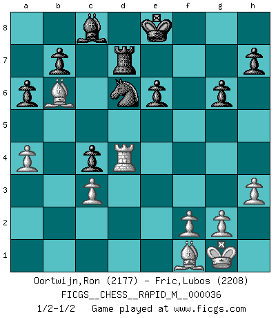 Last move : 1/2-1/2 2011 March 16 0:41:13 [Event "FICGS__CHESS__RAPID_M__000036"] [Site "FICGS"] [Date "2010.11.16"] [Round "1"] [White "Oortwijn,Ron"] [Black "Fric,Lubos"] [Result "1/2-1/2"] [WhiteElo "2177"] [BlackElo "2208"] 1.e4 e6 2.d4 d5 3.Nc3 Bb4 4.e5 c5 5.a3 Bxc3+ 6.bxc3 Ne7 7.Qg4 O-O 8.Bd3 f5 9.exf6 Rxf6 10.Bg5 Rf7 11.Qh5 g6 12.Qd1 Nbc6 13.Nf3 Qa5 14.Bd2 c4 15.Be2 Nf5 16.O-O Bd7 17.Re1 Re8 18.Bf1 Nd6 19.a4 a6 20.h3 Rfe7 21.Rb1 Bc8 22.Bf4 Ne4 23.Rxe4 dxe4 24.Nd2 Qxc3 25.Nxe4 Qxd4 26.Qxd4 Nxd4 27.Nf6+ Kf7 28.Nxe8 Kxe8 29.c3 Rf7 30.Be3 Nf5 31.Bb6 Nd6 32.Rd1 Rd7 33.Rd4 1/2-1/2 French : Winawer, Advance, poisoned pawn variation Kingside Castling by player Black (move 7) Kingside Castling by player White (move 16) This chess game ended in a draw. Follow this game move after move (download)You cannot play at Chess if you are kind-hearted. (French Proverb) Ein Springer auf f6 gegen die eigene Rochadestellung ist schlimmer als ein rostiger Nagel im Knie. (Efim Bogoljubov) El Ajedrez es de 30 a 40 por ciento psicología. Uno no cuenta con esto cuando se juega contra una computadora. No lo puedo confundir. (Judith Polgar) Vous m'avez demandé de vous exposer quel est le fondement de la prière. Je ne fais que préparer les pièces du jeu sur la table... Nous sera-t-il permis d'en adopter les règles et si nous les appliquons scrupuleusement nous ne tarderons pas à faire mat le Roi divin ! Il ne pourra échapper à nos mains. (Sainte Thérèse d'Avila, Chemin de perfection) To steal ideas from one person is plagiarism. To steal from many is research. (Unknown)