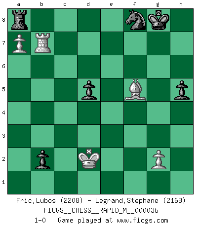Last move : 1-0 2011 July 9 2:32:2 [Event "FICGS__CHESS__RAPID_M__000036"] [Site "FICGS"] [Date "2010.11.16"] [Round "1"] [White "Fric,Lubos"] [Black "Legrand,Stephane"] [Result "1-0"] [WhiteElo "2208"] [BlackElo "2168"] 1.d4 d5 2.c4 e6 3.Nc3 Nf6 4.cxd5 exd5 5.Bg5 Be7 6.e3 c6 7.Bd3 O-O 8.Nge2 Nbd7 9.Qc2 Re8 10.O-O Nf8 11.f3 Be6 12.Rad1 Ng6 13.Ng3 Rc8 14.a3 Kh8 15.Rfe1 Nd7 16.Bxe7 Nxe7 17.Qf2 Qc7 18.Nh5 Rcd8 19.Ne2 Qd6 20.Neg3 Nf8 21.Bc2 f6 22.Bb1 Bf7 23.Nf4 Kg8 24.Rc1 Qb8 25.h4 Neg6 26.Nxg6 Bxg6 27.Ba2 Bf7 28.f4 Qd6 29.h5 h6 30.Rc3 a5 31.Bb1 Be6 32.Bd3 a4 33.b4 axb3 34.Rxb3 b5 35.Rc1 Ra8 36.Rbc3 Bd7 37.Nf5 Bxf5 38.Bxf5 Ra6 39.Qf3 Re7 40.Kh2 Re8 41.Qg4 Kh8 42.Bb1 Rb6 43.Qf5 Qe7 44.Rb3 Ra6 45.Rc5 Rd8 46.Rbc3 Rb6 47.Bc2 Rd6 48.a4 b4 49.Rb3 Rb8 50.Bb1 Re6 51.a5 Qd8 52.Qg4 Qd6 53.a6 Qc7 54.e4 Qe7 55.e5 fxe5 56.fxe5 Rxe5 57.Bf5 Re1 58.Rxc6 Rf1 59.Rf3 Rxf3 60.Qxf3 Qh4+ 61.Bh3 Qxd4 62.Rc7 b3 63.a7 Ra8 64.Rf7 Qe5+ 65.Qg3 Qxg3+ 66.Kxg3 g6 67.hxg6 Nxg6 68.Rb7 b2 69.Bf5 Nf8 70.Kf3 h5 71.Ke2 Kg8 72.Kd2 1-0 QGD : Exchange, positional line Kingside Castling by player Black (move 7) Kingside Castling by player White (move 10) Player White won this chess game. Follow this game move after move (download)We must make sure that Chess will not be like a dead language, very interesting, but for a very small group. (Sytze Faber) Modernes Schach erfordert enorme Anspannung. Es ist für einen normalen Menschen unmöglich das auszuhalten. (Viktor Kortschnoi) La táctica fluye a partir de una posición superior. (Bobby Fischer) Des points faibles ou des trous dans la position de l'adversaire doivent être occupés par des pièces et non pas par des pions. (Siegbert Tarrasch) Life is like a play: it's not the length but the excellence of the acting that matters. (Seneca)
