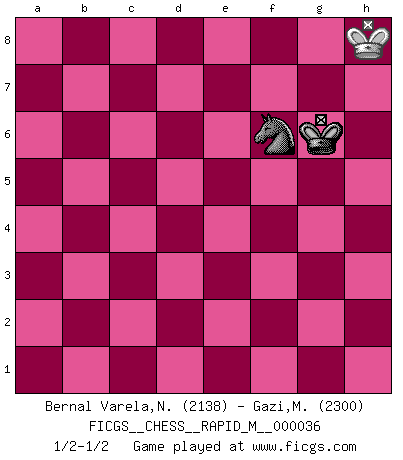 Last move : 1/2-1/2 2011 June 17 14:37:45 [Event "FICGS__CHESS__RAPID_M__000036"] [Site "FICGS"] [Date "2010.11.16"] [Round "1"] [White "Bernal Varela,Nelson"] [Black "Gazi,Miroslav"] [Result "1/2-1/2"] [WhiteElo "2138"] [BlackElo "2300"] 1.e4 c5 2.Nf3 d6 3.d4 cxd4 4.Nxd4 Nf6 5.Nc3 a6 6.Bg5 e6 7.f4 Qb6 8.Nb3 Be7 9.Qf3 Qc7 10.Be2 b5 11.e5 Bb7 12.Qe3 dxe5 13.fxe5 Nd5 14.Nxd5 Bxd5 15.Bxe7 Qxe7 16.Bf3 Bxf3 17.Qxf3 Ra7 18.O-O O-O 19.Rad1 Rc7 20.Qe4 Rc4 21.Qe2 Rd8 22.c3 h6 23.h3 R4c8 24.Rxd8+ Rxd8 25.Rd1 Rd7 26.Rd3 Rxd3 27.Qxd3 Qc7 28.Qd6 Qxd6 29.exd6 Nd7 30.Nd4 Kf8 31.Nc6 f5 32.Nd8 e5 33.b4 Nf6 34.Nc6 e4 35.Ne7 f4 36.Ng6+ Ke8 37.Nxf4 Kd7 38.Kf2 g5 39.Ne2 Nd5 40.Ng3 Nxc3 41.a3 Kxd6 42.Nf5+ Ke6 43.Nxh6 Nb1 44.Ng4 Nxa3 45.Ne3 Nc4 46.g3 Ke5 47.Ke2 Kd4 48.Nf5+ Kc3 49.h4 gxh4 50.gxh4 Ne5 51.Ke3 Ng4+ 52.Kxe4 Kxb4 53.Kd5 a5 54.Nd4 a4 55.Nc6+ Kc3 56.Kc5 a3 57.Nb4 Ne5 58.Kxb5 Kb3 59.h5 a2 60.Nxa2 Kxa2 61.Ka4 Ng4 62.Kb4 Kb2 63.h6 Nxh6 64.Ka4 Kc3 65.Ka3 Nf5 66.Ka2 Nd4 67.Ka1 Nc2+ 68.Ka2 Nb4+ 69.Ka1 Kb3 70.Kb1 Na2 71.Ka1 Ka3 72.Kb1 Nb4 73.Kc1 Na2+ 74.Kd2 Kb2 75.Kd3 Nc1+ 76.Ke4 Ne2 77.Ke5 Kc3 78.Kf6 Kd4 79.Kg7 Ke5 80.Kh8 Kf6 81.Kg8 Nf4 82.Kh8 Ng6+ 83.Kg8 Ne7+ 84.Kh8 Ng6+ 85.Kg8 Ne7+ 86.Kh8 Nd5 87.Kg8 Kg6 88.Kh8 Kf7 89.Kh7 Nf6+ 90.Kh8 Nd5 91.Kh7 Ne7 92.Kh8 Nf5 93.Kh7 Ne3 94.Kh8 Kg6 95.Kg8 Nd5 96.Kh8 Nf6 1/2-1/2 Sicilian : Najdorf, 7...Qb6 Kingside Castling by player White (move 18) Kingside Castling by player Black (move 18) 10 pieces endgame at move 49 : White KNPP , Black KNPPPP WHITE : King + 1 Knight 2 Pawns BLACK : King + 1 Knight 4 Pawns 9 pieces endgame at move 50 : White KNPP , Black KNPPP WHITE : King + 1 Knight 2 Pawns BLACK : King + 1 Knight 3 Pawns 8 pieces endgame at move 52 : White KNPP , Black KNPP WHITE : King + 1 Knight 2 Pawns BLACK : King + 1 Knight 2 Pawns 7 pieces endgame at move 52 : White KNP , Black KNPP WHITE : King + 1 Knight 1 Pawn BLACK : King + 1 Knight 2 Pawns 6 pieces endgame at move 58 : White KNP , Black KNP WHITE : King + 1 Knight 1 Pawn BLACK : King + 1 Knight 1 Pawn 5 pieces endgame at move 60 : White KNP , Black KN WHITE : King + 1 Knight 1 Pawn BLACK : King + 1 Knight 4 pieces endgame at move 60 : White KP , Black KN WHITE : King + 1 Pawn BLACK : King + 1 Knight 3 pieces endgame at move 63 : White K , Black KN WHITE : King + BLACK : King + 1 Knight This chess game ended in a draw. Follow this game move after move (download)Chess is the art of analysis. (Mikhail Botvinnik) Ein Buch ist ein Spiegel; wenn ein Affe hineinsieht, so kann kein Apostel heraus gucken. (Georg Christoph Lichtenberg) Cuando tengo las piezas blancas, yo gano porque soy blanco; Cuando tengo las piezas negras, yo gano porque soy Bogolyubov. (Bogolyubov) Pour se monter efficace, un Cavalier a besoin d'avant-postes ! Les Cavaliers font les meilleurs bloqueurs de pions passés. It's unlucky to be superstitious. (Dave Enteles)
