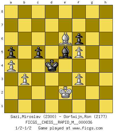 Last move : 1/2-1/2 2011 March 4 21:34:52 [Event "FICGS__CHESS__RAPID_M__000036"] [Site "FICGS"] [Date "2010.11.16"] [Round "1"] [White "Gazi,Miroslav"] [Black "Oortwijn,Ron"] [Result "1/2-1/2"] [WhiteElo "2300"] [BlackElo "2177"] 1.Nf3 Nf6 2.c4 e6 3.Nc3 d5 4.d4 c6 5.e3 Nbd7 6.Qc2 Bd6 7.Bd3 dxc4 8.Bxc4 O-O 9.O-O b5 10.Be2 Bb7 11.Rd1 Qc7 12.e4 e5 13.Bg5 exd4 14.Rxd4 Ne5 15.Bxf6 gxf6 16.g3 b4 17.Na4 c5 18.Rd2 Rfe8 19.Rad1 Rad8 20.b3 Nxf3+ 21.Bxf3 Bf8 22.Rxd8 Rxd8 23.Rxd8 Qxd8 24.Kg2 Qd4 25.Nb2 f5 26.exf5 Qc3 27.Qxc3 bxc3 28.Bxb7 cxb2 29.Be4 Bg7 30.Kf3 Bd4 31.g4 h6 32.h3 Kg7 33.Ke2 Be5 34.Kd2 Kf6 35.h4 Bf4+ 36.Kc3 Ke5 37.f3 Bc1 38.a4 a5 39.g5 hxg5 40.hxg5 Bxg5 41.Kxb2 Kd4 42.Kc2 Bd8 43.Bd3 f6 44.Bc4 Bc7 45.Kd2 Be5 46.Ke2 Bg3 47.Be6 Be5 1/2-1/2 Reti Opening Kingside Castling by player Black (move 8) Kingside Castling by player White (move 9) This chess game ended in a draw. Follow this game move after move (download)You must take your opponent into a deep dark forest where 2+2=5, and the path leading out is only wide enough for one. (Mikhail Tal) Wer wird heute Abend ihr Gegner sein? -- Heute Abend spiele ich gegen die schwarzen Steine. (Akiba Rubinstein) En el Ajedrez, tal como en la vida, las bendiciones de hoy pueden ser el veneno del mañana. (Assaic) Assurément je connaissais par expérience le mystérieux attrait de ce jeu royal, le seul entre tous les jeux inventés par les hommes qui échappe souverainement à la tyrannie du hasard, le seul où l'on ne doive sa victoire qu'à son intelligence ou plutôt à une certaine forme d'intelligence. Mais n'est-ce pas déjà le limiter injurieusement que d'appeler les échecs un jeu ? N'est-ce pas une science, un art ou quelque chose qui, comme le cercueil de Mahomet entre ciel et terre, est suspendu entre l'un et l'autre, et qui réunit un nombre incroyable de contraires ? [...] C'est une pensée qui ne mène à rien, une mathématique qui n'établit rien, un art qui ne laisse pas d'uvre, une architecture sans matière; et il l'a prouvé néanmoins qu'il était plus durable, à sa manière, que les livres ou que tout autre monument, ce jeu unique qui appartient à tous les peuples et à tous les temps, et dont personne ne sait quel dieu en fit don à la terre pour tuer l'ennui, pour aiguiser l'esprit et stimuler l'âme. Où commence-t-il, où finit-il ? (Stefan Zweig) May the force be with you. (Han Solo in Star Wars ep.4)