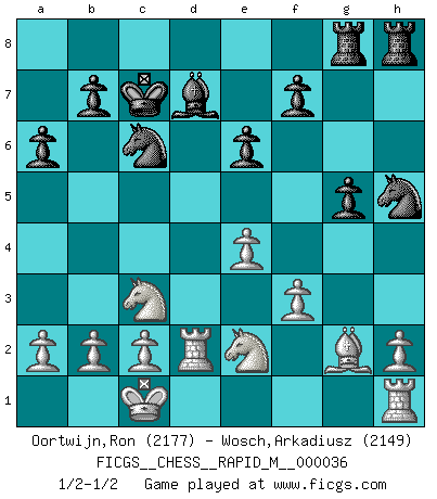 Last move : 1/2-1/2 2010 December 20 9:42:26 [Event "FICGS__CHESS__RAPID_M__000036"] [Site "FICGS"] [Date "2010.11.16"] [Round "1"] [White "Oortwijn,Ron"] [Black "Wosch,Arkadiusz"] [Result "1/2-1/2"] [WhiteElo "2177"] [BlackElo "2149"] 1.e4 c5 2.Nf3 Nc6 3.d4 cxd4 4.Nxd4 Nf6 5.Nc3 d6 6.Bg5 e6 7.Qd2 a6 8.f3 Bd7 9.O-O-O Be7 10.g4 h5 11.gxh5 Nxh5 12.Bxe7 Qxe7 13.Nde2 O-O-O 14.Qxd6 Qxd6 15.Rxd6 Kc7 16.Rd2 g5 17.Bg2 Rdg8 1/2-1/2 Sicilian defense Queenside Castling by player White (move 9) Queenside Castling by player Black (move 13) This chess game ended in a draw. Follow this game move after move (download)It is the aim of the modern school, not to treat every position according to one general law, but according to the principle inherent in the position. (Richard Reti) Alles was ich jemals tun will ist Schach spielen. (Robert James Fischer) Te sientas frente a un tablero y repentinamente tu corazón brinca. Tu mano tiembla al tomar una pieza y moverla. Pero lo que el Ajedrez te enseña es que tu debes permanecer ahí con calma y pensar de que si realmente es una buena idea o de que si hay otras ideas mejores. (Stanley Kubrick) Un footballeur joue avec ses pieds, parfois avec sa tête. Un joueur d'échecs ne joue qu'avec sa tête. Et quand il ne joue plus, il meurt. (Jacob Murray) There is no instance of a country having benefited from prolonged warfare. (Sun Tzu)